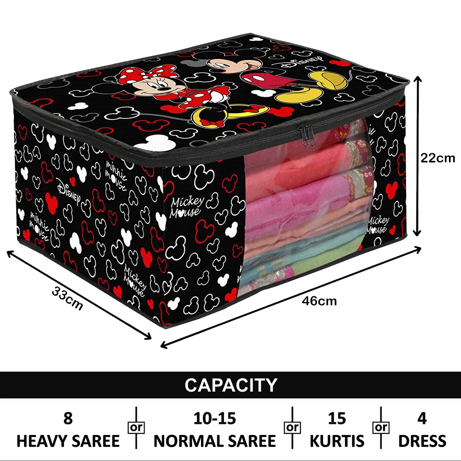 Heart Home has always been coming up with Innovative Products to take care of your family, maybe you all must have liked our Products. So we are Continuously Providing quality Products to maintain the satisfaction of the customers. In order to organize and store your heavy and expensive sarees, we present to you, Disney Mickey Print Saree Cover to protect it from dust, dirt and water. This beautiful Disney Mickey print will decorate and organize your wardrobe at the same time. Transparent front window gives you better visibility. 2 premium quality zippers for easy opening and closing. Which also makes it durable and waterproof. Best option to use while traveling. Large front window to quickly see what's inside without having to open the bag again and again. To keep your belongings safe from dust, dirt and scratches.Detailed Specifications:
