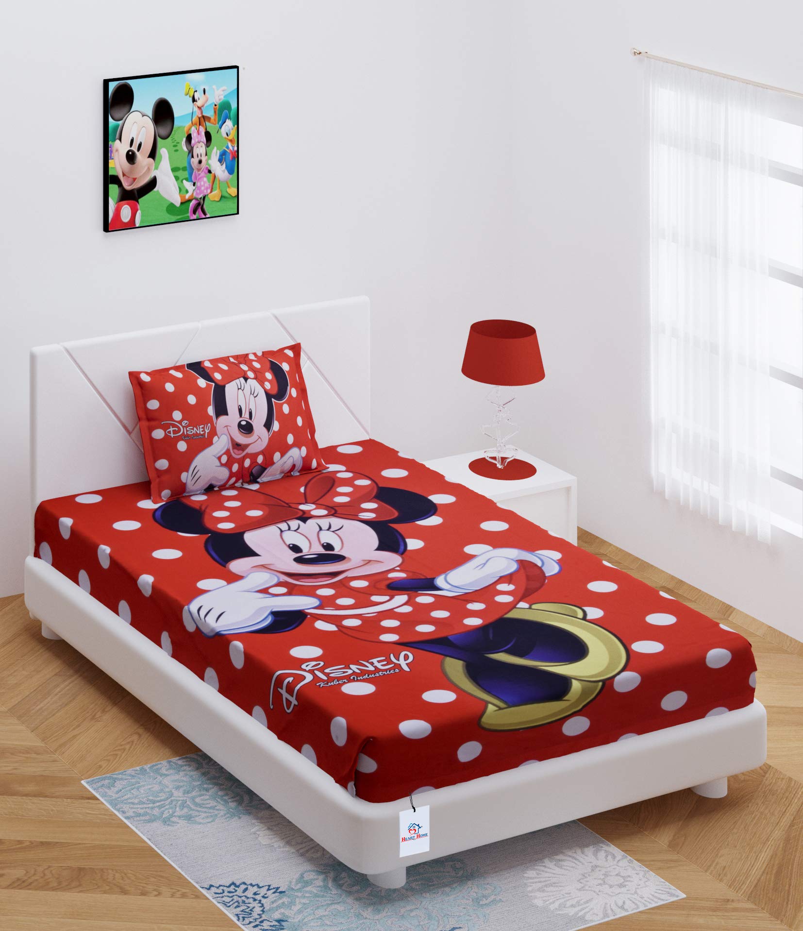 Package Contents : 1 Single Bedsheet with 1 Pillow Cover,Material: Silk, Color: Red. Design- Disney Minnie Print,Size:- Bedsheet - 60 inch x 90 inch or 152 cm x 228 cm, Pillow Cover - 18 inch x 27 inch or 46 cm x 68 cm,Premium cotton single bedsheet,Large size to make it easy to tuck-in below the bed,Long-lasting and luxuriously soft 144 TC bedsheet,Colour fade resistant for all-season use,Light weight and easy to wash at home,ALL-SEASON COMFORT: Designed for year-round use, this cotton bedsheet makes the perfect addition to any bedroom. Toss it over you when you're relaxing on the sofa during chilly fall or spring evenings, or use it as a layering piece under your quilt or bedspread in the summerDetailed Specifications: