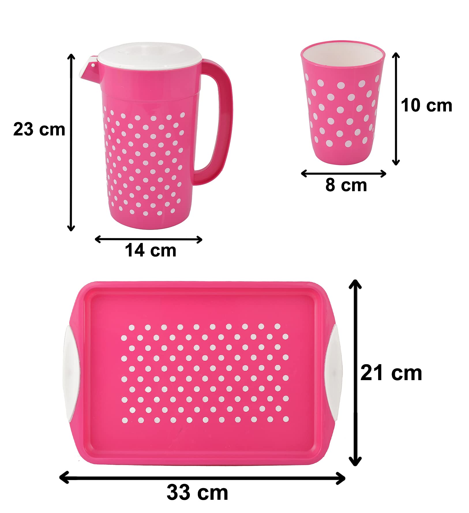 Heart Home unbreakable 1 Water Jug, 1 Tray and 6 Pieces Glass Combo Set for Dining Table This combo set will make your kitchen and dining table very beautiful. It’s a BPA free, leak proof, break proof and crystal clear. Keeps water odorless from everything already kept in refrigerator. Unlike plastic will not leech chemicals into your food even over repeated usage. Ideal for store water and juices and other cold items. Non insulated, transparent body with attractive design Lid with grip for easy opening. Having a party or a meeting you always need a set of glass serve water and juices, these fractious glass set is a perfect set which can be used.Detailed Specifications: