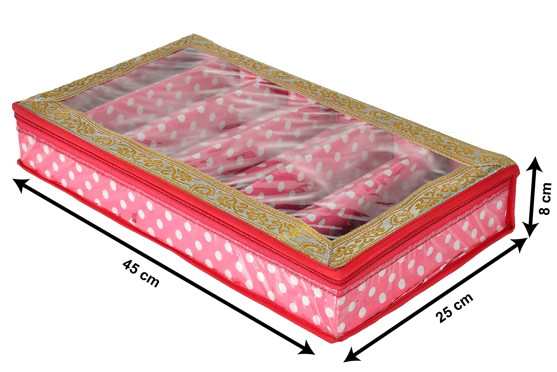 Heart Home Bangle box is made of good quality pvc material so, this is very durable, long-lasting and very useful. A bangle is an ageless accessory that has a special place in every woman's collection. The bangle box or a casket is a beautiful container and is mostly used to keep many high-end accessories and precious jewelry. The bangle box is a one-stop solution to all the problems. The safety of bangles is ensured as it has a high-class supportive frame that serves the purpose well. The classy bangles can be saved from any kind of vulnerability of harm or damage. It prolongs the natural shine and shimmer of the bangles that make them look like new and brings in loads of appreciation. The arranged bangle box saves you from extra efforts to save the most complimenting thing of your jewelry. It can prove to be the most beautiful gift ever if you plan to give it to your near and dear ones. The box can also be a holder of minute earpieces or very small jewelry. It prevents any loss or misplacement of any jewelry kept inside it the future use.Detailed Specifications: