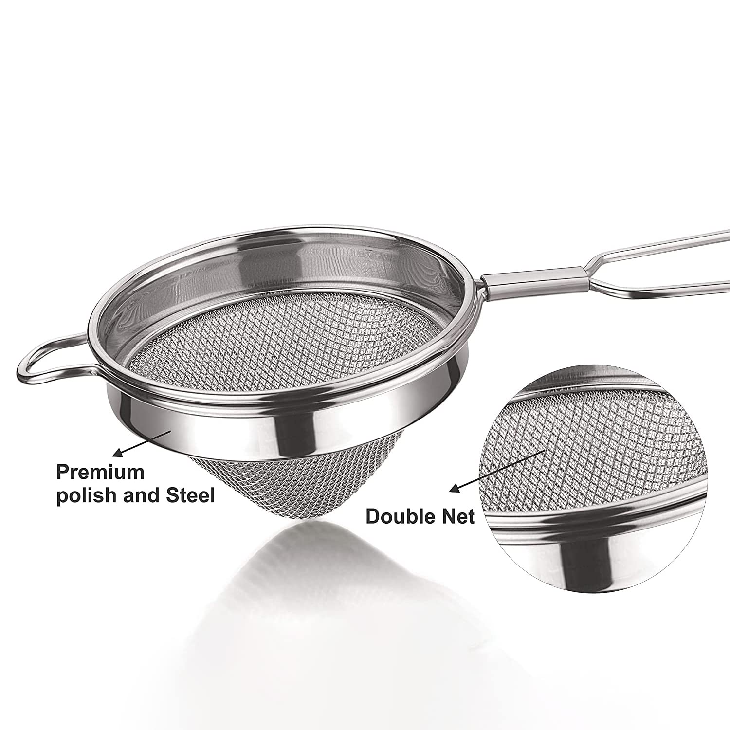 Heart Home Tea Strainer is useful in multipurpose. You can Use it for the strain the juice, You can use it fot the tea OR Coffee also. Or you can use it for the other Strainer Works. Perfect for making drinks like herb tea, chai, cocoa, juice, and cocktails. It also strain & sift the smallest foods including almond milk, yogurt, smoothies, soups, quinoa, and many more. This strainer comfortable, non-slip, heat-proof handles for easier handling and safety. We made the wire mesh finer to strain & sift the smallest foods. We sealed the steel rim to prevent food from getting stuck between it and the mesh. Other strainers bend and flex easily, but not our strainers. It comes with non-slip, heat-resistant handle allow you to strain your food easily while maintaining control in slippery conditions and protecting your hands from burns. Excellent kitchen aid for those who struggle with arthritis. This small mesh strainer is heat resistant and very easy to clean. Clean it by hand or in a dishwasher - whichever you prefer.Detailed Specifications: