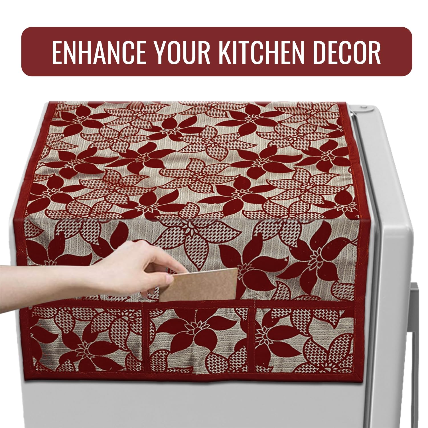 Kuber Industries is a well-known brand that provides a variety of products for your home and kitchen. One of their offerings is the Fridge Top Cover, designed to enhance both the style and usefulness of your kitchen. This cover serves as a great way to transform the top of your fridge. It helps protect the fridge's top from the usual wear and tear it faces in the kitchen. By using this cover, you can prevent scratches, spills, and the general busyness of the kitchen from affecting the top of your refrigerator. It's a practical and attractive addition to your kitchen setup.Detailed Specifications: