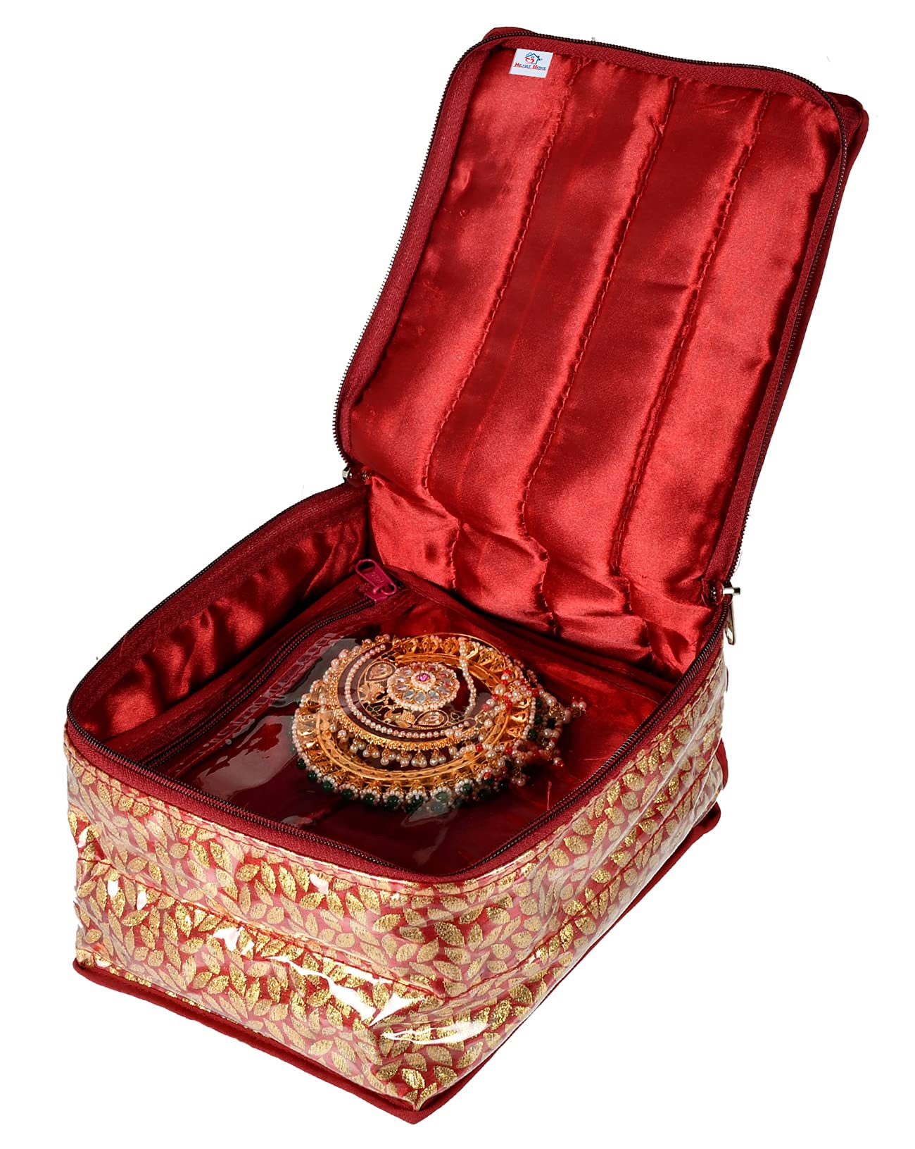 Heart Home Jewellery organizer helps organize your costly and favorite Jewellery while travelling or at home. 10 transparent pouches store & multi pockets can store your earrings,Pendants,Necklace,Bracelet, Ring, Watches,Chains,Pearl Jewellery,Accessory,Head rope,Headband or nail polish, cuffs, makeup brushes, Eye shadow etc. It give you the convenience to separately store your Jewellery as per your need. It can also be used for gifting, trousseau packing, in your wardrobe, bank lockers etc.Detailed Specifications: