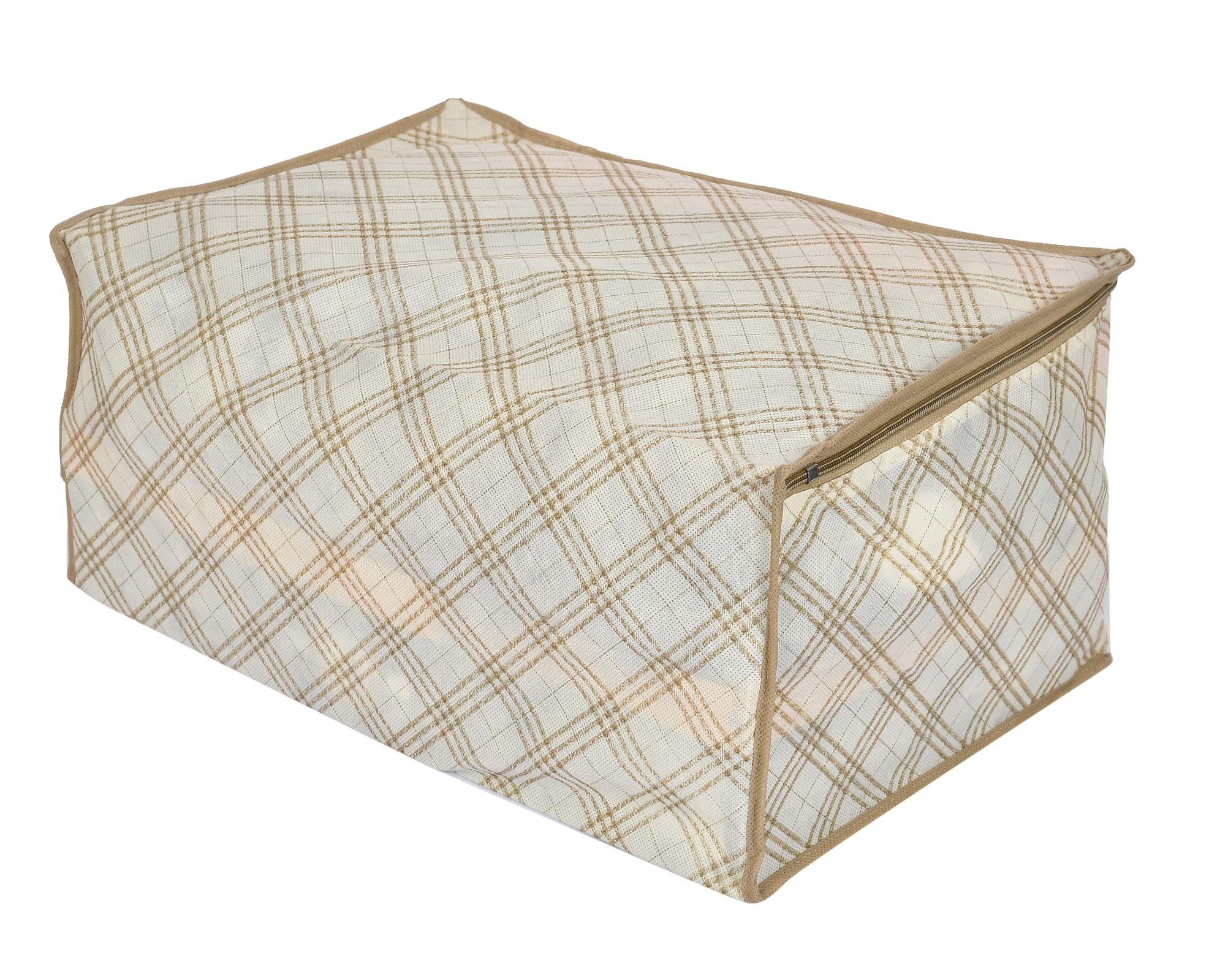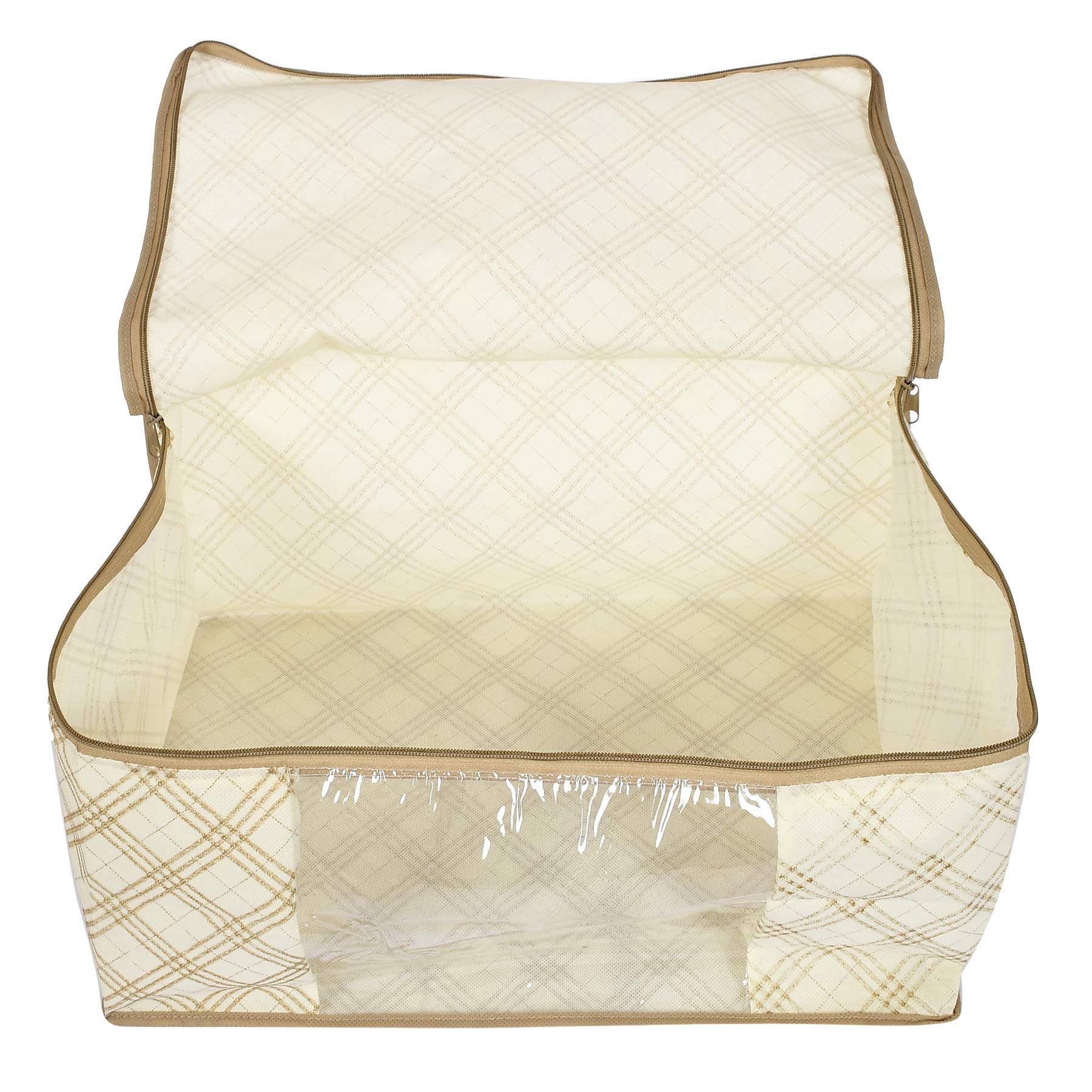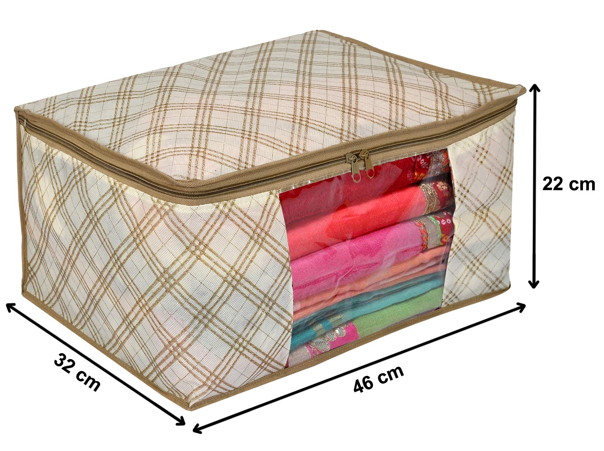 Heart Home Non Woven Metalic Checkered Print Saree/Clothes Cover with Window Heart Home non woven Metalic Checkered Print saree cover to organize and store your heavy and costly sarees dust, dirt and water safe. This beautiful Metalic Checkered Print makes your wardrobe looks beautiful and organized too. Transparent front window gives you the convenience of better visibility. 2 premium quality zippers for easy opening and closing. Made of VIRGIN 90 GSM non woven fabric makes it durable and water repellent too. Best option to use while travelling.Large Front Window to instantly know what is kept inside without opening the bag again and again.Cotton breathable fabric to keep your stuff inside protected from dust dirt and bad spell. Quilted from all the sides to give cushion to whatever is stored inside.Description