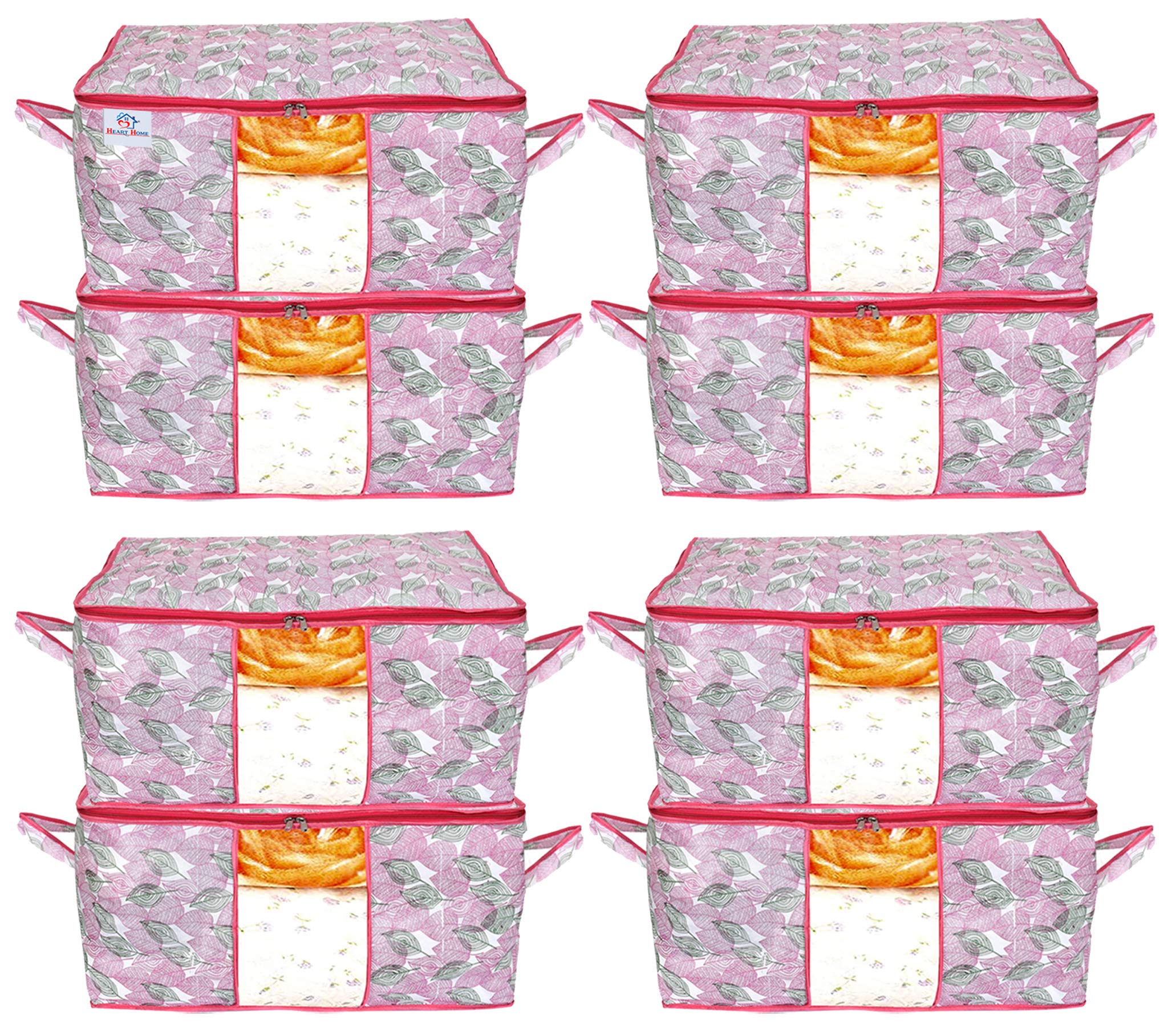 Heart Home Metalic Leafy Print Non Woven 8 Pieces Underbed Storage Bag,Cloth Organiser,Blanket Cover with Transparent Window (Pink)-HHEART16623