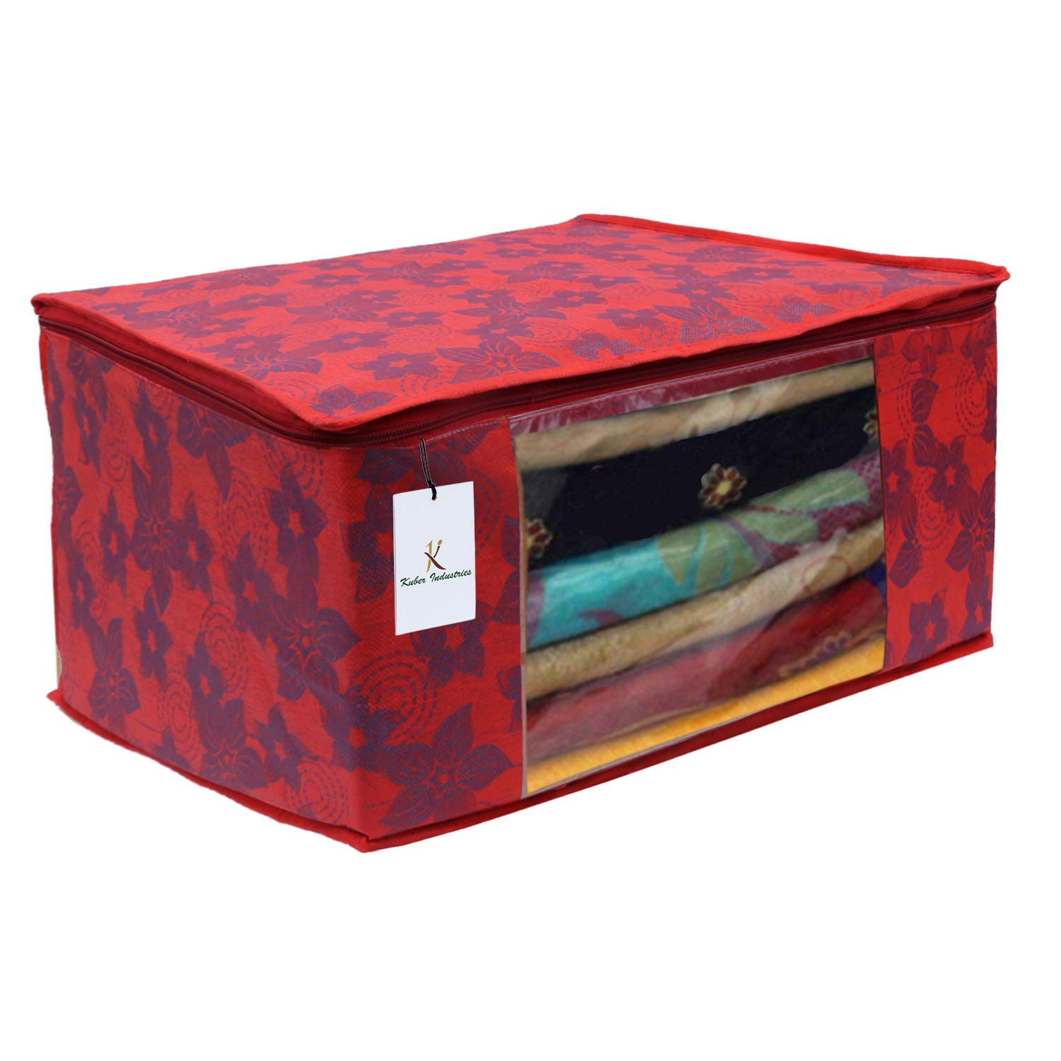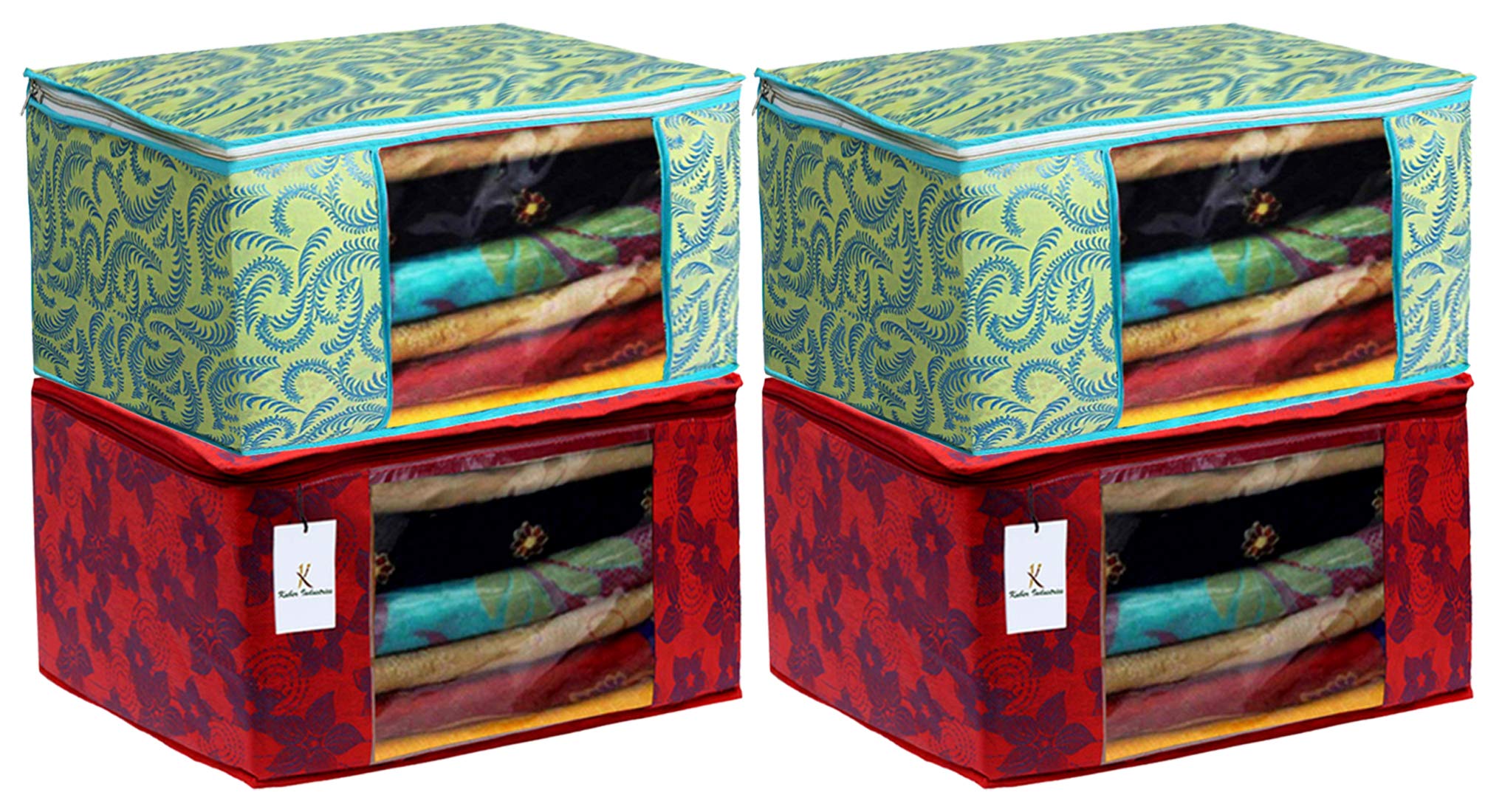 Material: Non Woven, Color: Green & Red. Design- Metalic Printed .Package Contents: 4 Piece Saree Cover .Size: 43 cm x 35 cm x 22 cm .Made from durable, wear and tear-resistant non-woven fabric. Lightweight and flexible saree covers .Carefully stitched to offer additional strength. Ideal for storing sarees and protecting them from dust and insects .Transparent see-through window for easy identification of contents. Durable zipper for easy opening and closing
