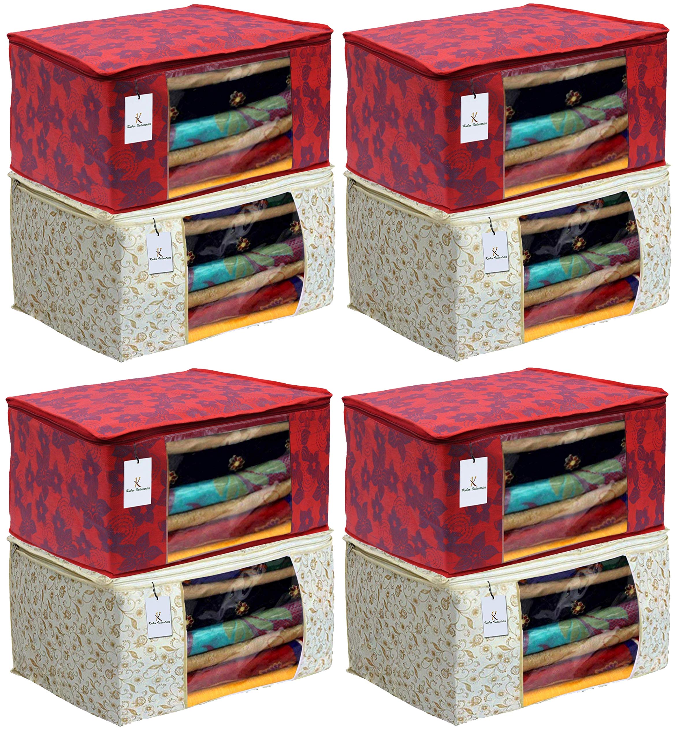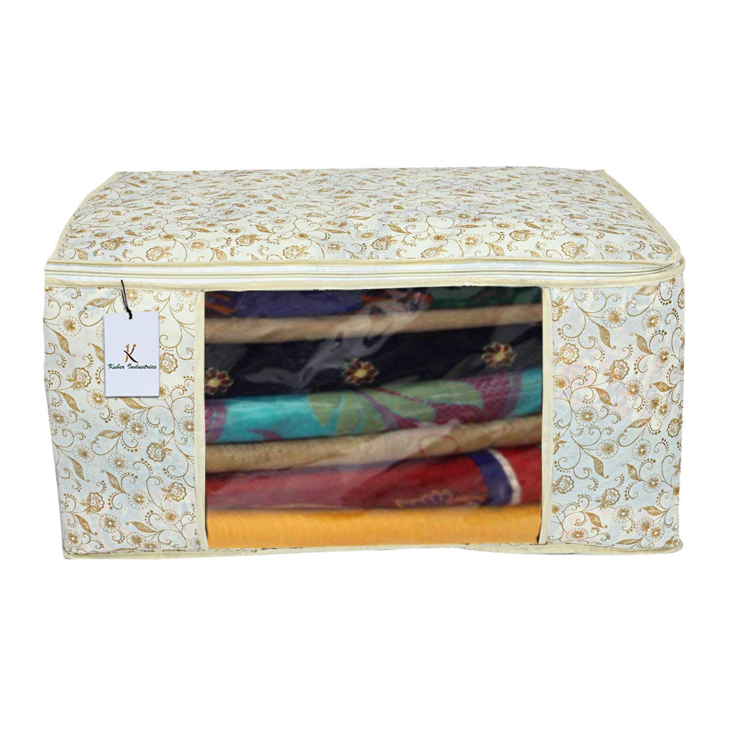 Material: Non Woven, Color: Brown & Red. Design- Metalic Printed .Package Contents: 8 Piece Saree Cover .Size: 43 cm x 35 cm x 22 cm .Made from durable, wear and tear-resistant non-woven fabric. Lightweight and flexible saree covers .Carefully stitched to offer additional strength. Ideal for storing sarees and protecting them from dust and insects .Transparent see-through window for easy identification of contents. Durable zipper for easy opening and closing