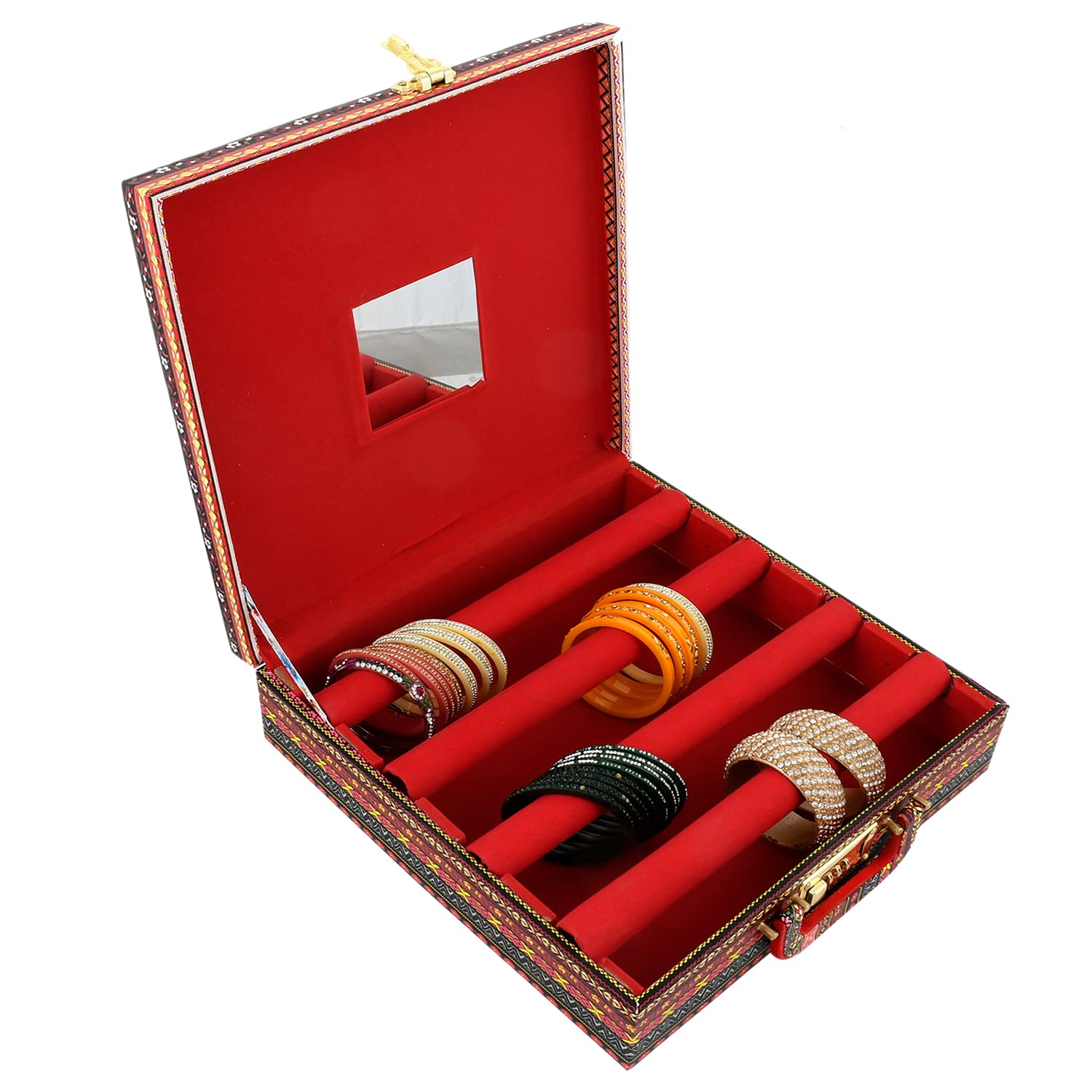 • . It hold bangles stiffly at a place and avoid unnecessary tangling and breaking. It gives them a strong and stable hold to keep the brittle and beautiful bangles safe. It can accommodate many bangles and helps you in organizing them safely. The box is strong and thus helps in holding the bangles to avoid any breaking and damage. The strong frame fits at any comfortable place and looks indeed beautiful due to its decoration on a strong frame