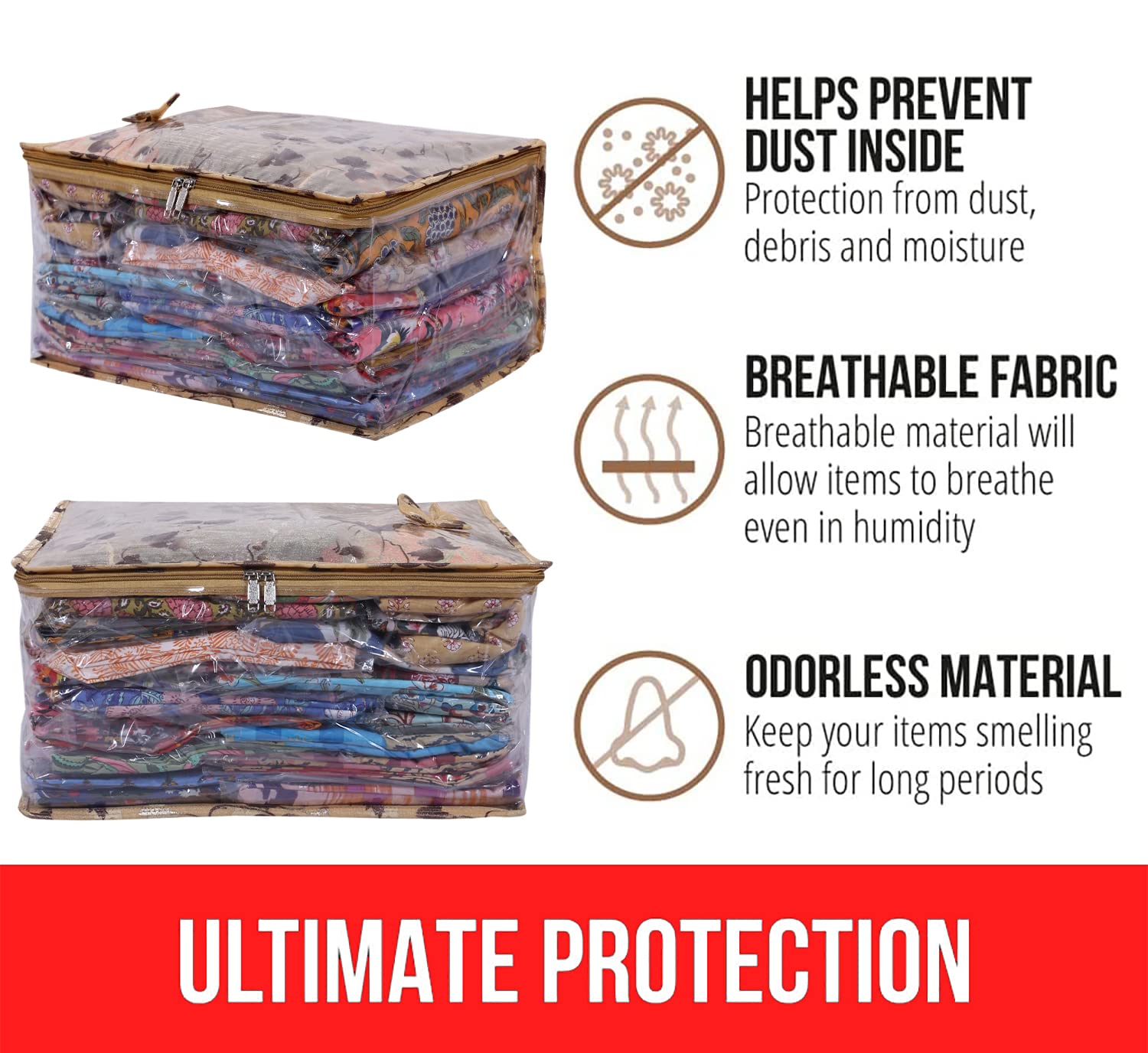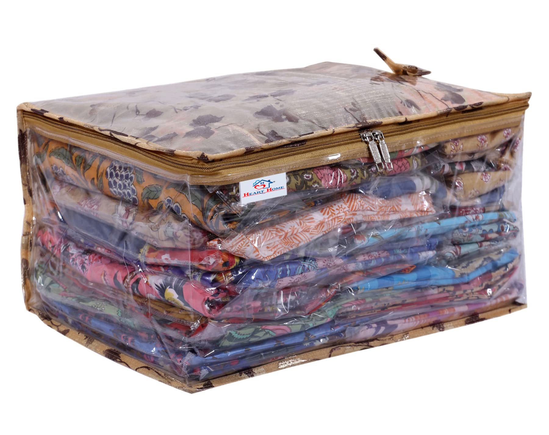 Heart Home cloth organizer great organizing companion for your clothes in the wardrobe that keeps your clothes well maintained in one place. It also saves your efforts for finding Saree at the right time. Ideal for storing saree, lehenga, suits, comforters, blankets, clothes, pillows, toys etc. To protect your precious sarees we have come up with PVC fabric which is currently the highest standard in the saree cover / saree bag market , Long life saree cover bag for organizing your costly and favorite sarees. The High quality zip design ensures that the chances of a zip failure is minimum, Zipper for easy opening and closing,. Can keep sarees, suits, cloth cover, shirts ,To ensure that our customers never face a problem with the zippers in the saree cover / saree bag we have gone a step ahead in introducing double zipper. This saree covers are Lightweight and Portable, easily Move to Shelves, Closets, Wardrobe etc—Quickly Pack/Unpack between Seasons, Traveling, Moving, or as Needed. Fold Away or Collapse Flat Under Bed or in Drawers When Not in Use.Detailed Specifications: