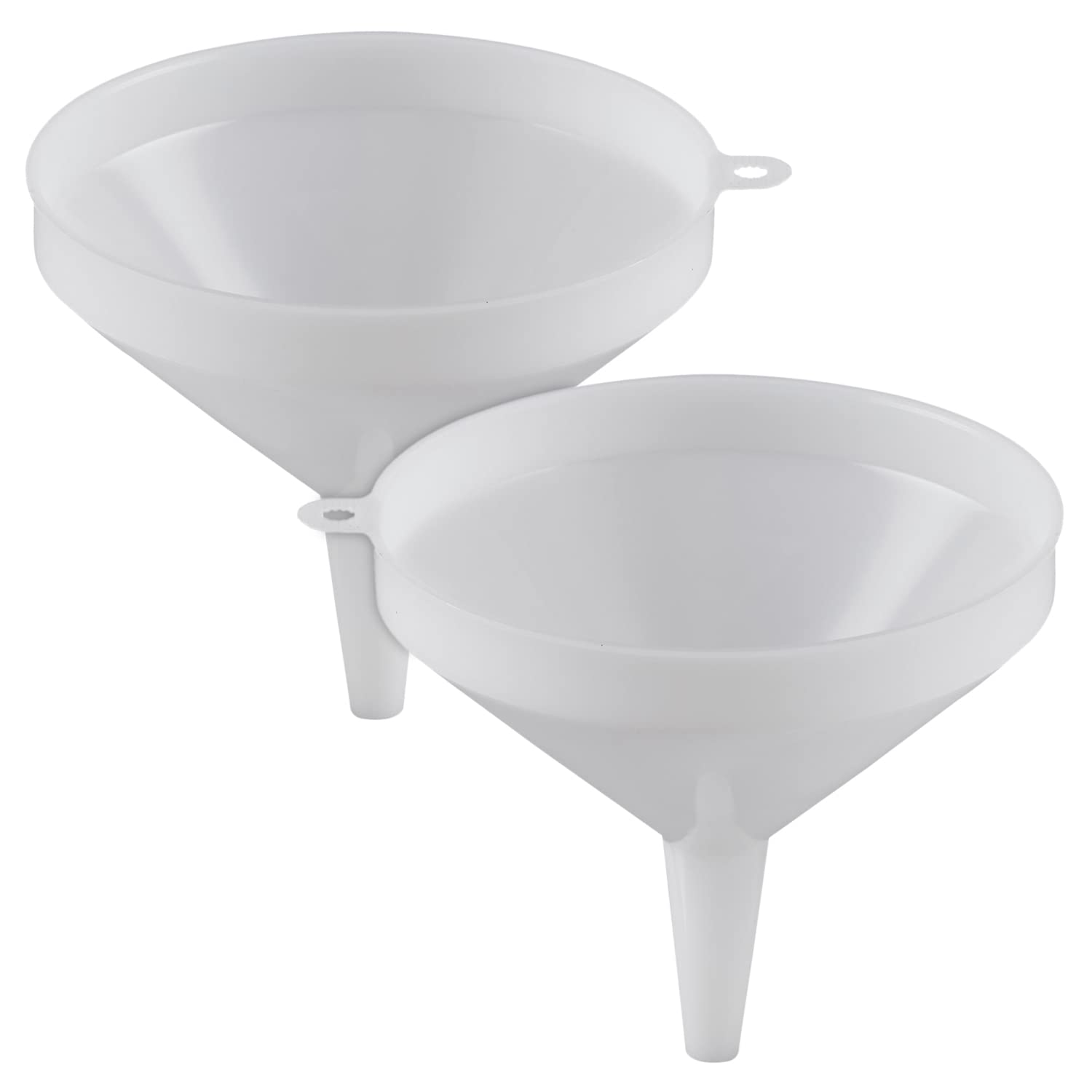 Heart Home presents multiuses large Plastic Funnel made with heavey plastic material, this wide mouth lets you pour the liquid into it, even from a substantial height and ensures that it does not splash out. From the rim to the bottom the funnel is deep which reduces the chances of spillage by ensuring that the funnels do not topple over.Lightweight Long Lasting Durable and firm grip comfortable to hold oil resistant Plastic, Completed with handy storage hanging tab, each pourer has his own hanger/holder, easily nests together for compact storage, easy to clean. Use Funnel for easy fast and clean transferring fluid, liquids, dry goods, spices, powders, small-grained ingredients, or seeds, between bottles, containers, cruets, jars, narrow-necked flasks, tubes, or vials, ends waste and eliminates messes, for residential and commercial use.Detailed Specifications: