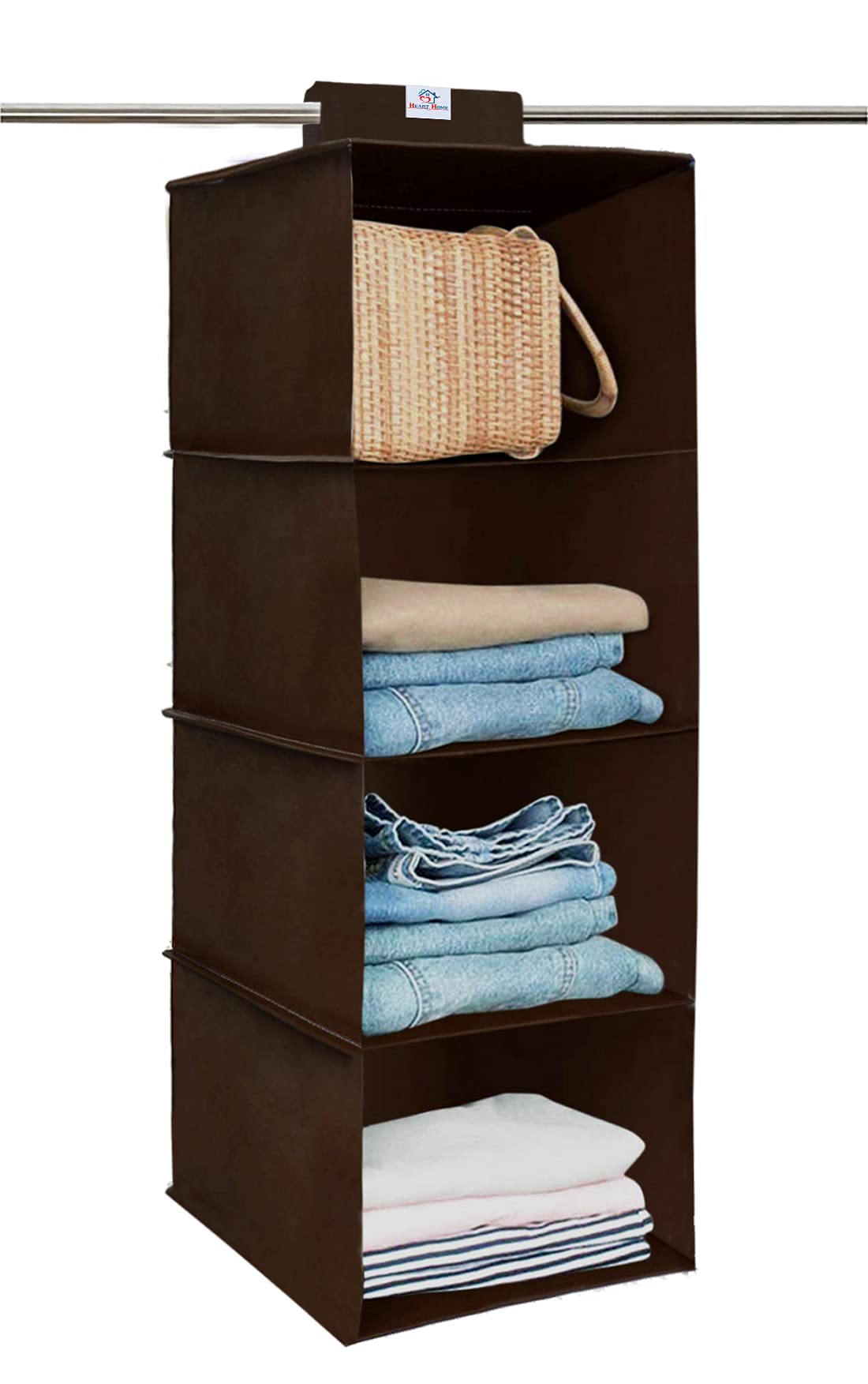 Hanging Closet Organizer, 4-Shelves Closet Hanging Sweater Organizer Collapsible Hanging Storage Shelves for Clothes, Pants and Shoes, Coffee Easy Installing Either with the hook and loop or the hooks, two hanging methods help the closet fit on most garment rods. Sturdy Thickened Board: Thickened boards inside help to share the weight and prevent the shelf from sagging. They can bear a 40 lbs heavy load and not bend the top. Multifunctional Use: Clothes, underwear, cosmetics, books, toys, sundries .Pick up everything you mess up, use space more efficiently and cleanly. Collapsible Design: It is simple and easy to assemble, you dont need an expert to assemble or disband it. You could simply fold it up when you dont use it.Detailed Specifications: