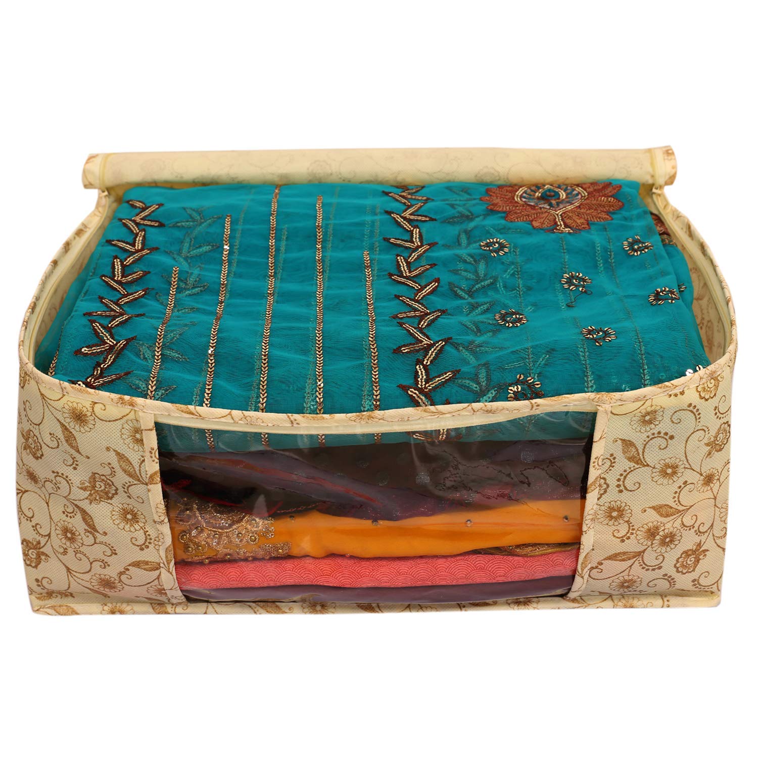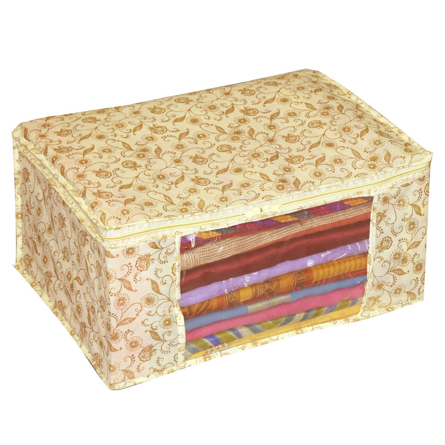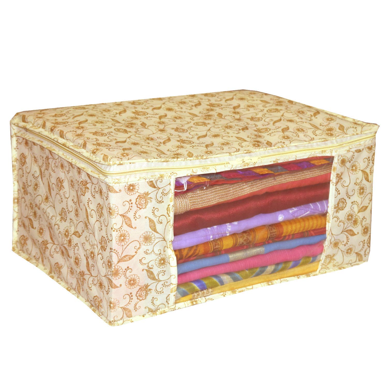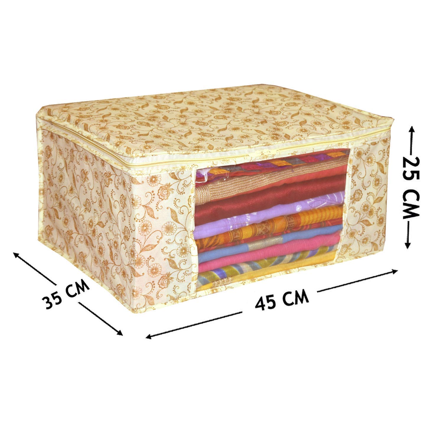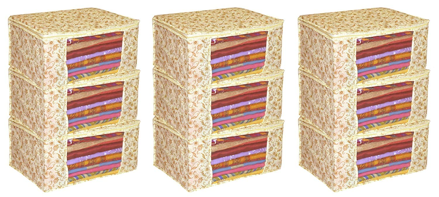 Package Content- 9 Pcs. Color- Brown, Design-Metalic Gold Print..Size: 43 cm x 33 cm x 18 cm.Care Instructions: Clean with a dry cloth.Premium Quality Zipper for Easy Opening and Closing Transparent front window for Clear Visibility.Long life quality saree cover Bag for organizing your costly and favourite sarees