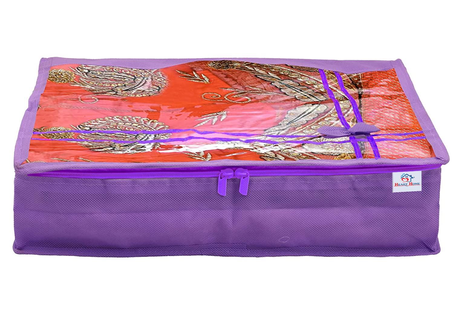 Heart Home brings home storage solution for all your storage problems. Saree covers for your convenience. It is the perfect solution to keep expensive sarees and other garments in one bag to avoid dust, insect and moisture. Transparent plastic view from the front for your sarees. It is made with good quality Fabric with clear Thick plastic Top for inside view, It is provided with anti-slide zipper - making it lightweight and durable. Every wedding and the festive season finished, you need to organize the off-season sarees into your closet or under-bed, if you put the sarees in the closet or under bed directly, they may look dirty when you wear them in next season, the saree bags will protect your sarees and keep them clean. These saree bags Organizing your suitcases or travelling bags is therefore very easy. Keep your sarees in these storage bags and stack them neatly in your cupboard, which can protect your sarees from dust This could be a perfect home to bedsheet, regular cotton or silk sarees, Lehenga, garment, suit, heavy wedding saree, single saari blouse, dress, shirt, t-shirt, coat, blazer, baby Kids toys.Detailed Specifications: