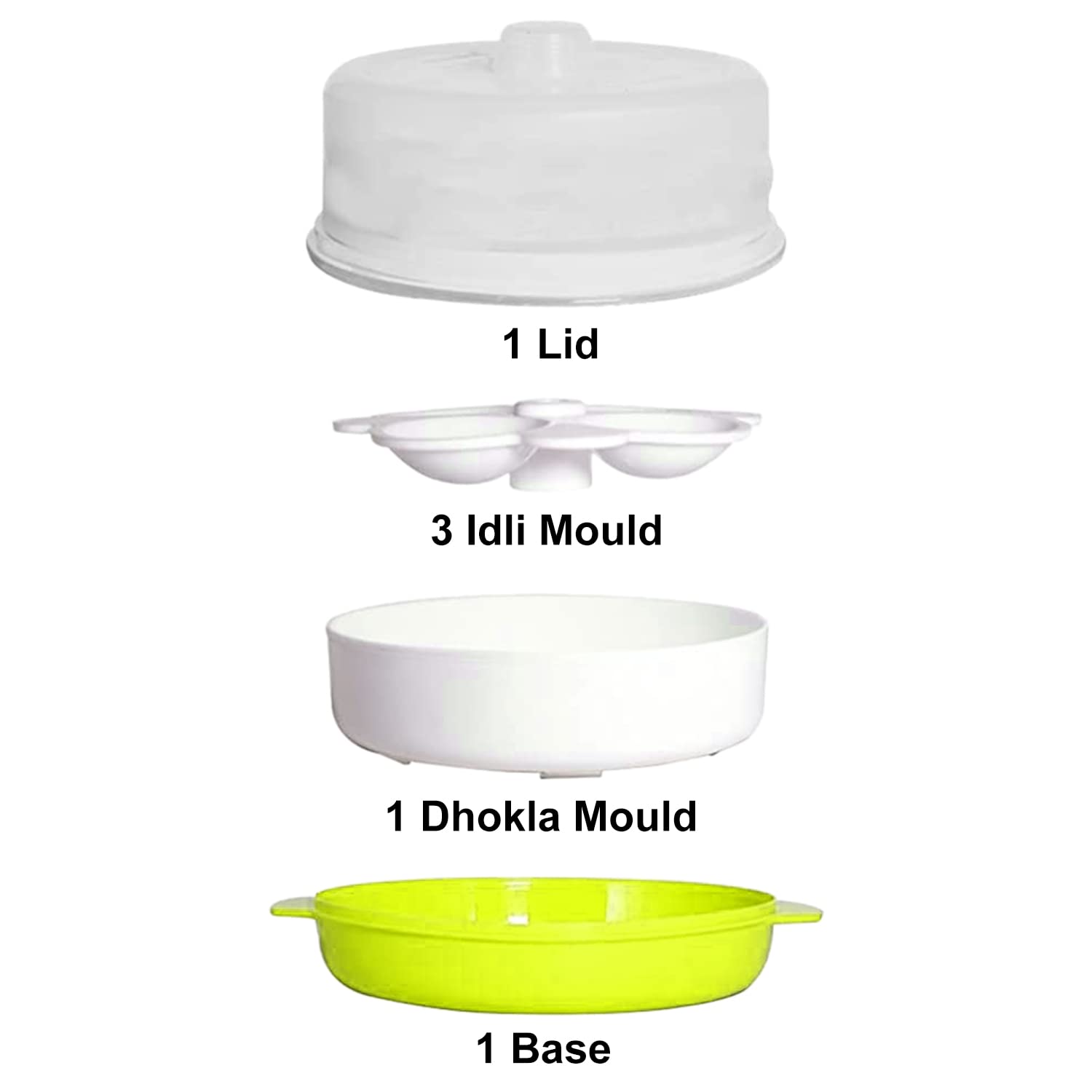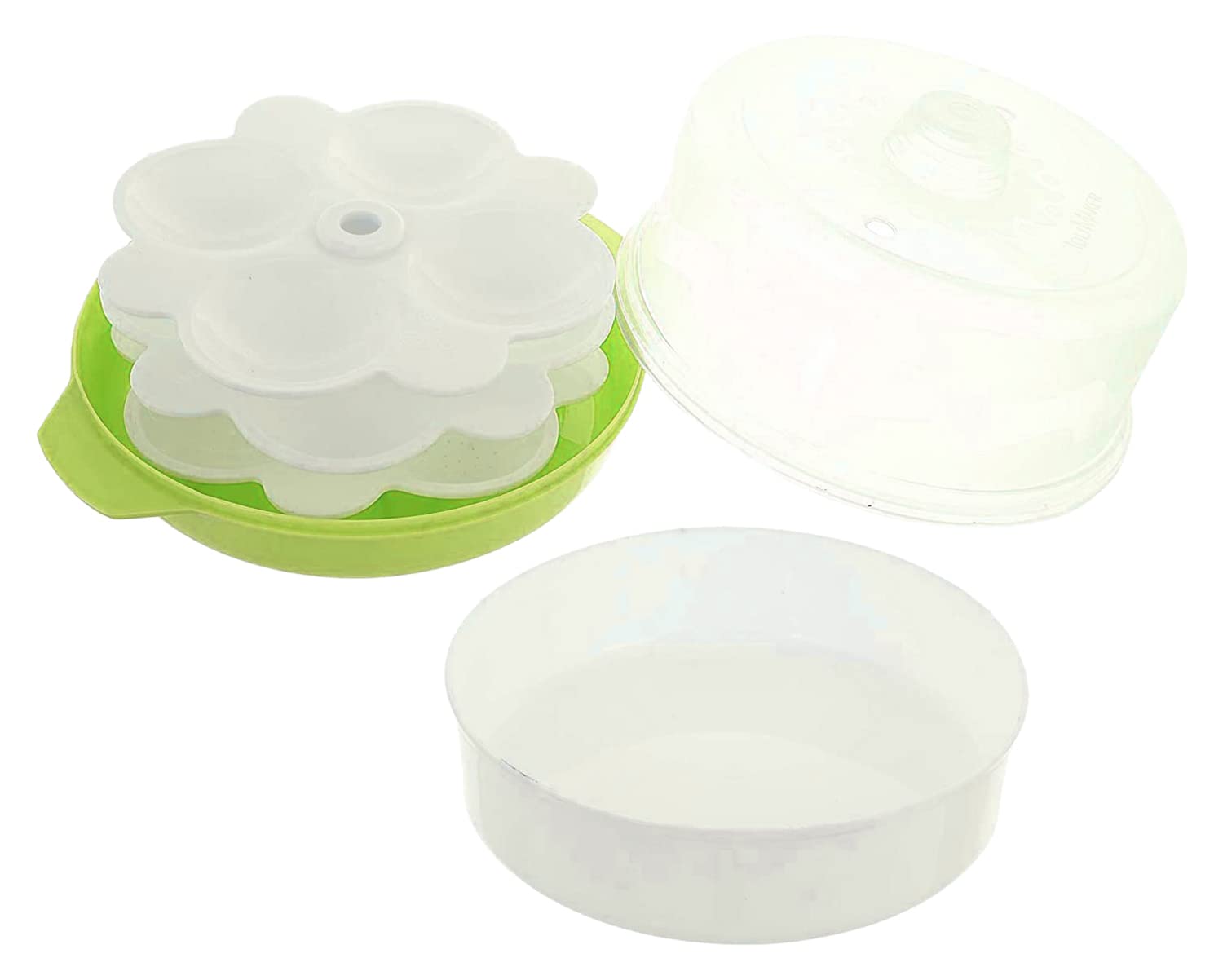 Heart Home allowing you to cook, steam, strain, reheat and serve all in one. You can cook: ldlis in idli trays. Dhokla, rice, soups, cakes, muffins and instant noodles in the container. Steam: Vegetables in the strainer. Strain: Vegetables, fruits, noodles, pasta in the strainer Reheat: Precooked food or ready to eat packaged food. This idli maker is made of high quality BPA free virgin plastic which does not leach any chemicals into your food. The virgin plastic cooking range is fit to be put in a microwave. It saves you a lot of time and hassles in the kitchen. It has come with 1 microwave idli maker and 3 idli trays and 1 dhokla tray. 3 idli tray which can cook 12 idlis, each idli slot has been made equally allowing for the perfect Idli Size. Whether it's large idlis, or our mini idli, both are made to perfection. These idli maker are easy to clean, you can wash them with soap, it also dishwasher safe.Detailed Specifications: