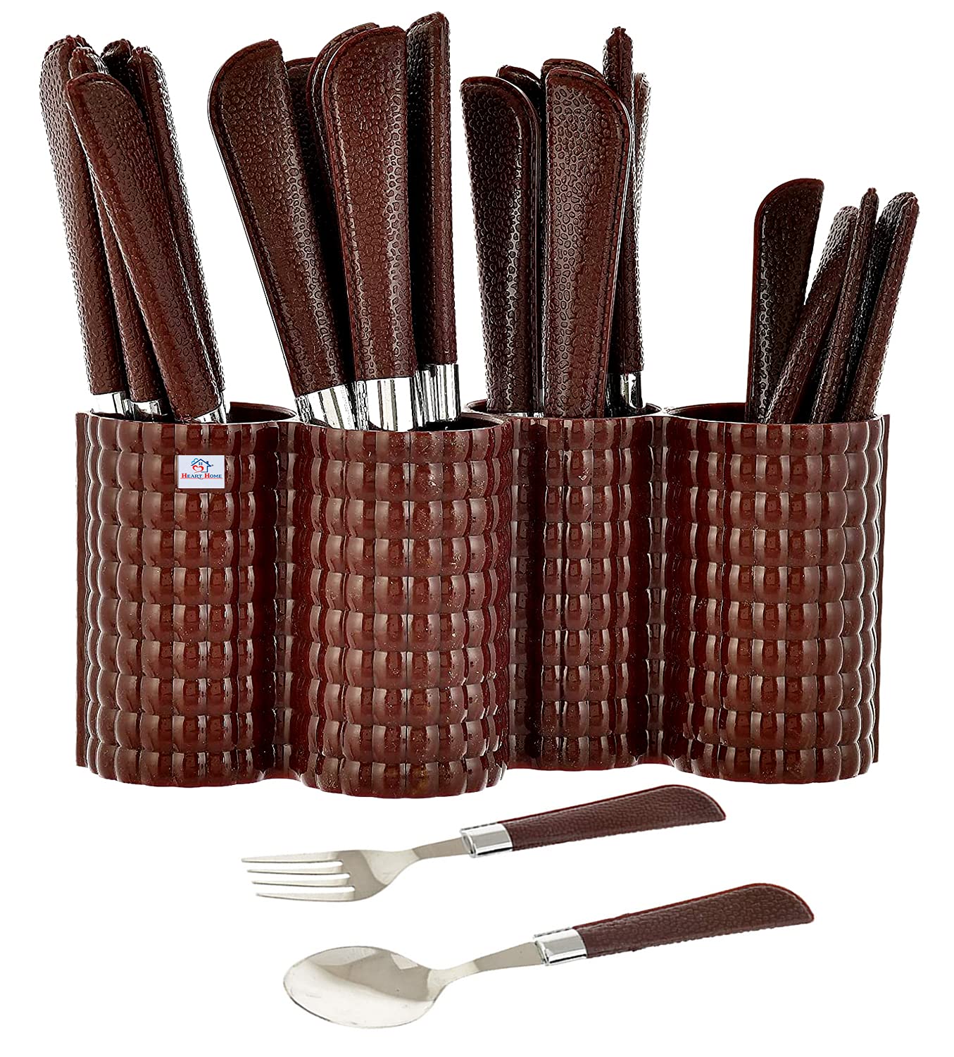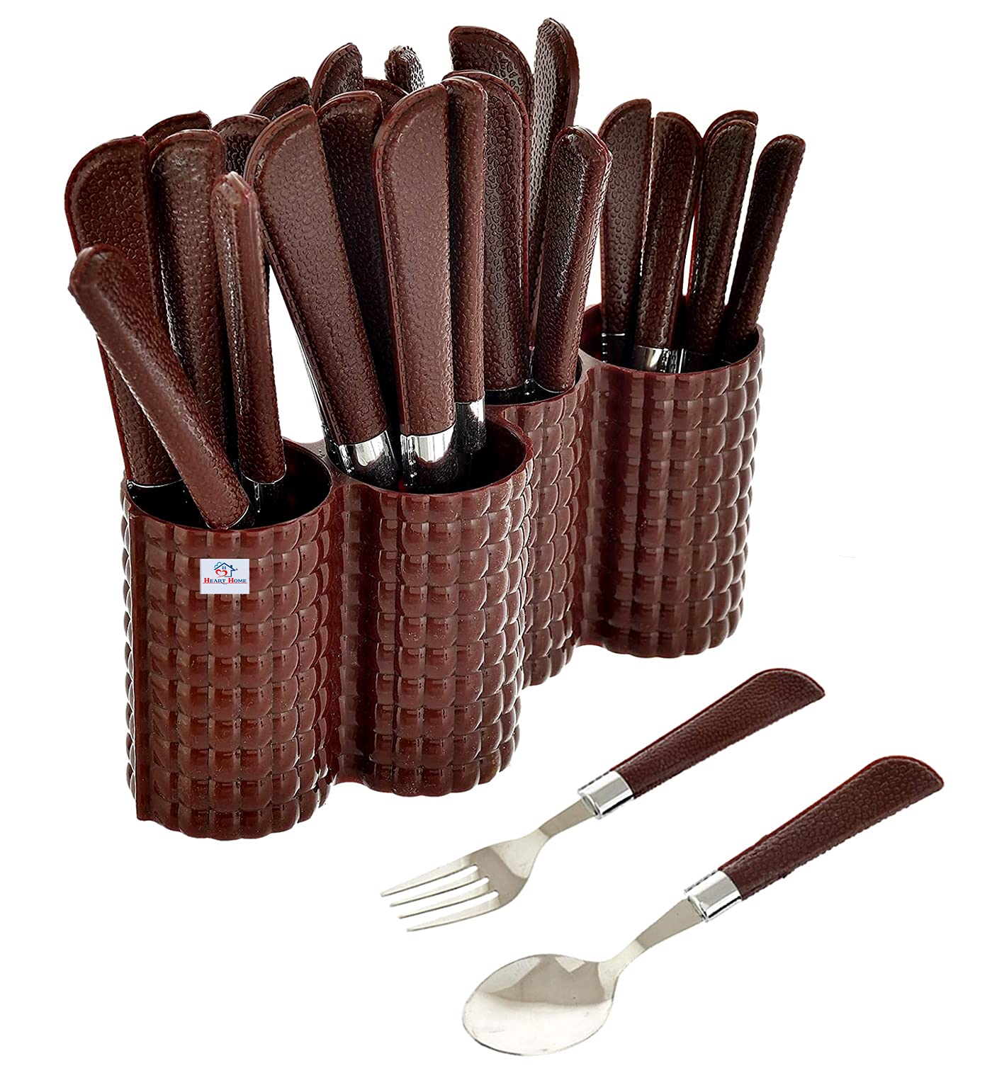 Heart Home set of flatware comes with a stand for holding each piece. It is very practical and will modernize your kitchen. Set of twenty pieces for a service of four people. Made of forged stainless steel material. The comfort grip on the handle is heat resistant and easily cleaned in the sink or in the dishwasher. These utensils are very lightweight, great for use in any kitchen 24pcs Stainless Steel Dinner Cafe Cutlery Set. 6 Dessert Spoon, 6 fork, 6 Soup Spoon, 6 Tea spoon Quality 24 pc stainless steel cutlery set. Great addition to your kitchen sets.Detailed Specifications: