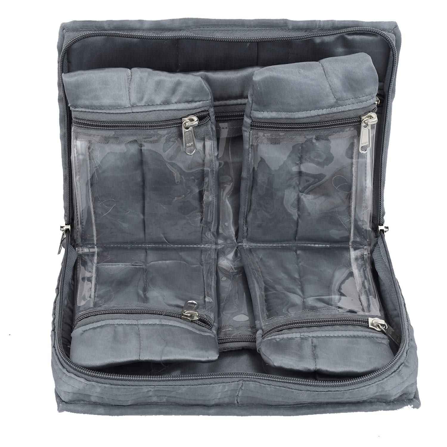 Made in heavy Quilted Satin Material. Color- Grey. 2 large & 4 small pockets are there in large box with two extra pocket & Pockets are inseparable. Dimension 10 3 6 Inches. Prevent your favourite costly cosmetic and jewelary from dust and moisture. It's a best option to use while travelling and it will help you to keep your costly cosmetics and jewelary in a separate kit from other items in your luggage.