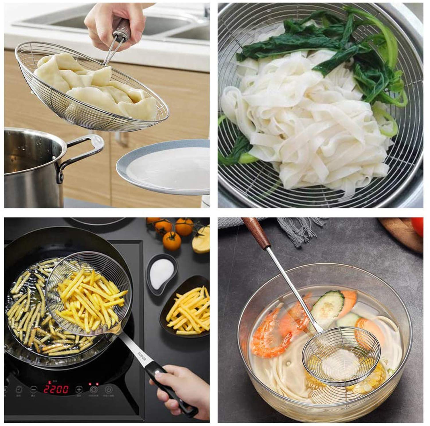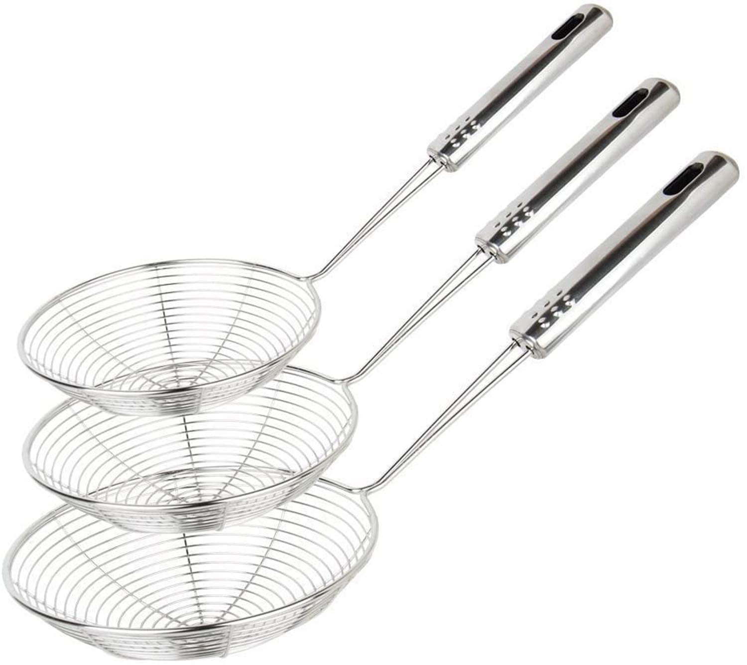 Made of high quality stainless steel. Strainer is an essential tool in our kitchen. This strainer is very convenient to choose for your kitchen and is perfect for sifting and straining wet or dry ingredients. This strainer is used to fry momos, puri, pasta, fish, French fries, vegetables, etc. The long handles protect your hands from hot grease and oils. It strains every drop of oil or liquid.