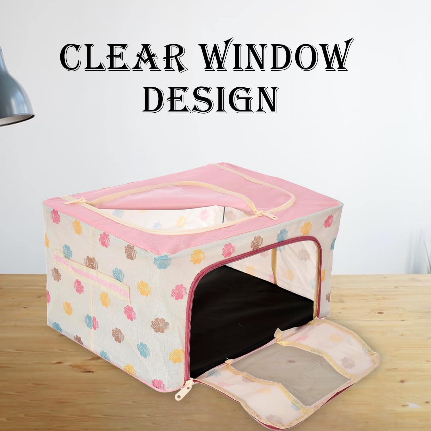Heart Home Storage Box | Steel Frame Living Box | Storage Organizer For Clothes | Saree Cover for Woman | Multi Flower Print Cloth Organizer | 22 Liter | Pack of 2 | Pink