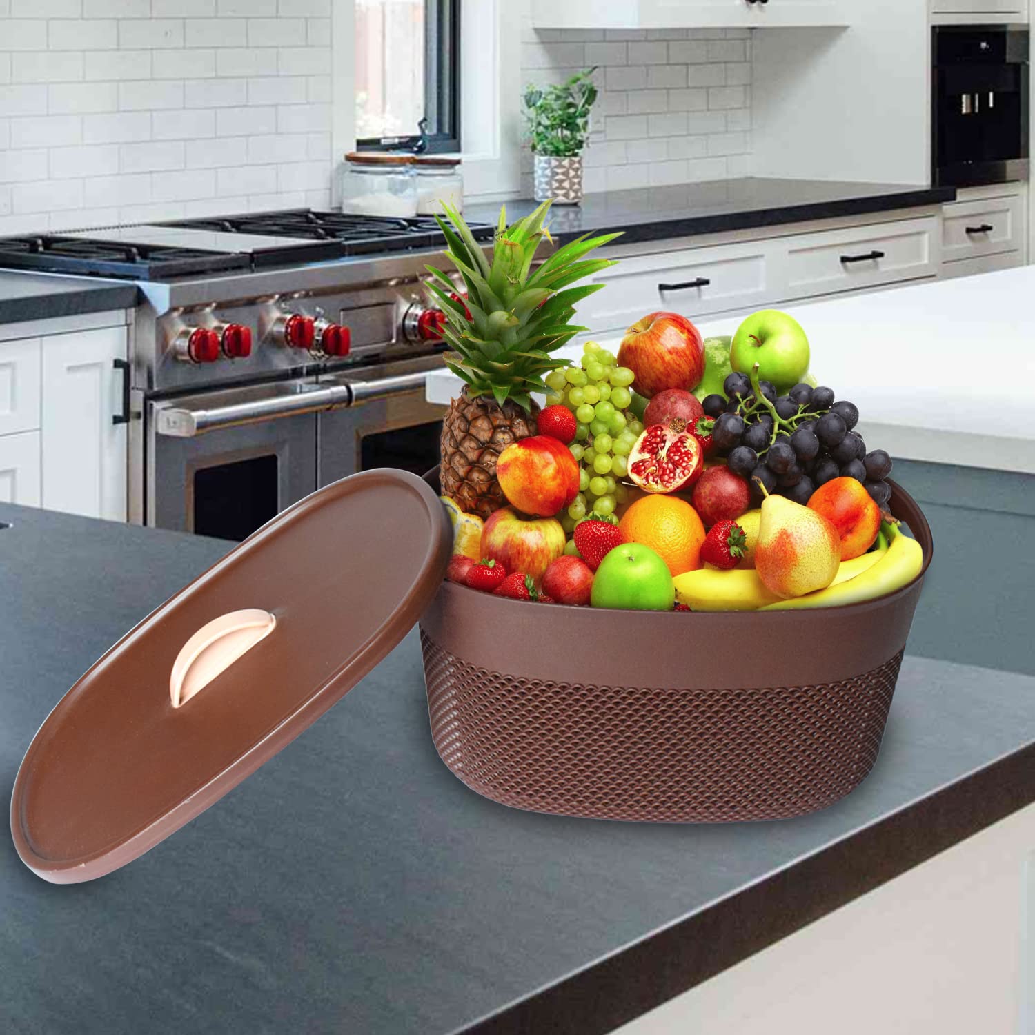 Kuber Industries premium design yet affordable baskets offer a stylish way to organize in almost any space in your home, office or kitchen. Great for organising clothing, bath & beauty products, toys, school supplies, grocery and more. Made in durable material, which keeps your things safely and quality construction of basket ensures durability. The stylish holes pattern gives you the facility of ventilation so that your belongings do not get spoiled. These baskets look premium yet are easy to maintain. The netted pattern allows water to easily flow through, thus facilitating convenience in cleaning.Detailed Specifications: