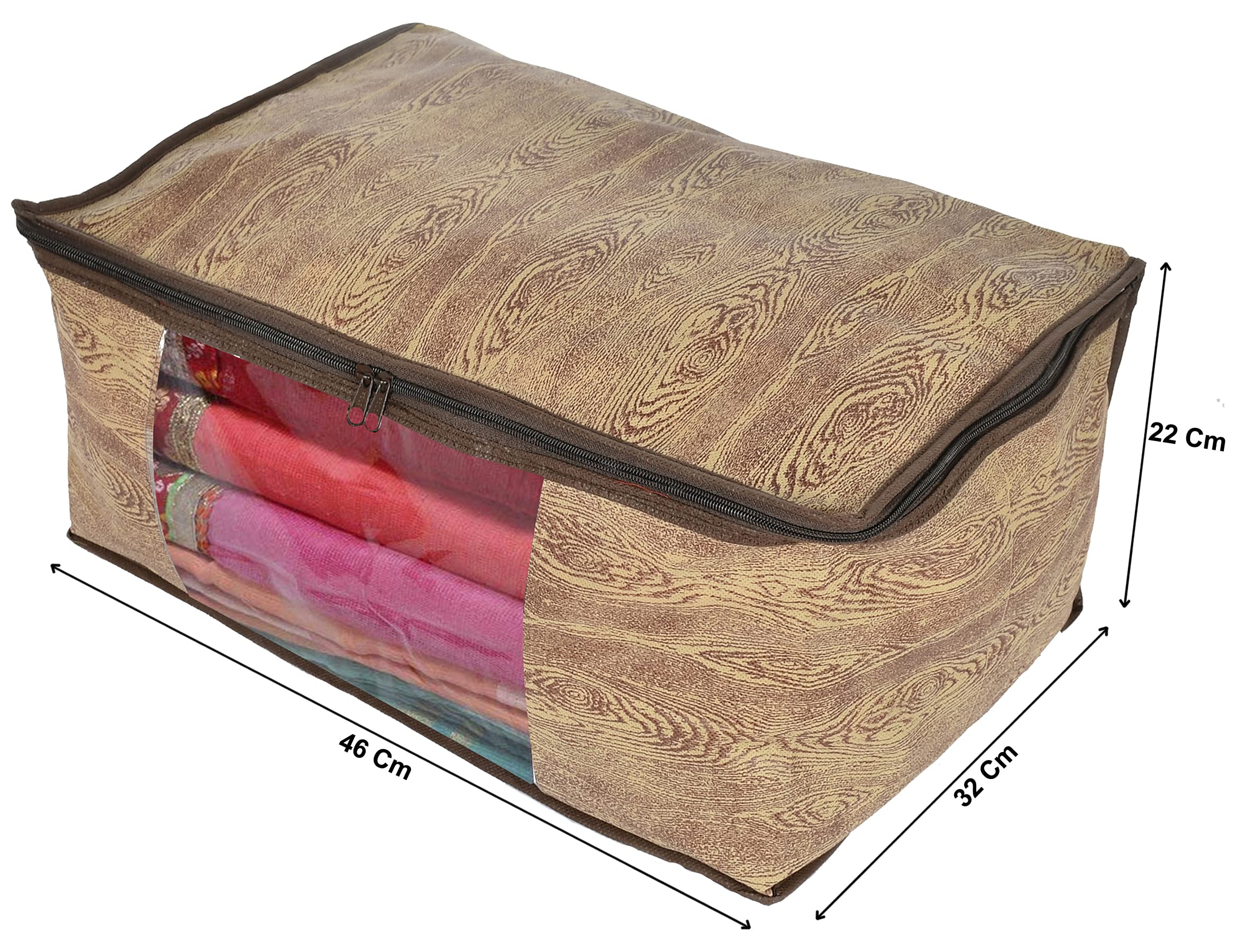 Heart Home Non Woven Wooden Print Saree/Clothes Cover with Window Heart Home non woven Wooden Print saree cover to organize and store your heavy and costly sarees dust, dirt and water safe. This beautiful Wooden Print makes your wardrobe looks beautiful and organized too. Transparent front window gives you the convenience of better visibility. 2 premium quality zippers for easy opening and closing. Made of VIRGIN 90 GSM non woven fabric makes it durable and water repellent too. Best option to use while travelling.Large Front Window to instantly know wHat is kept inside without opening the bag again and again.Cotton breatHable fabric to keep your stuff inside protected from dust dirt and bad spell. Quilted from all the sides to give cushion to wHatever is stored inside.DescriptionDetailed Specifications: