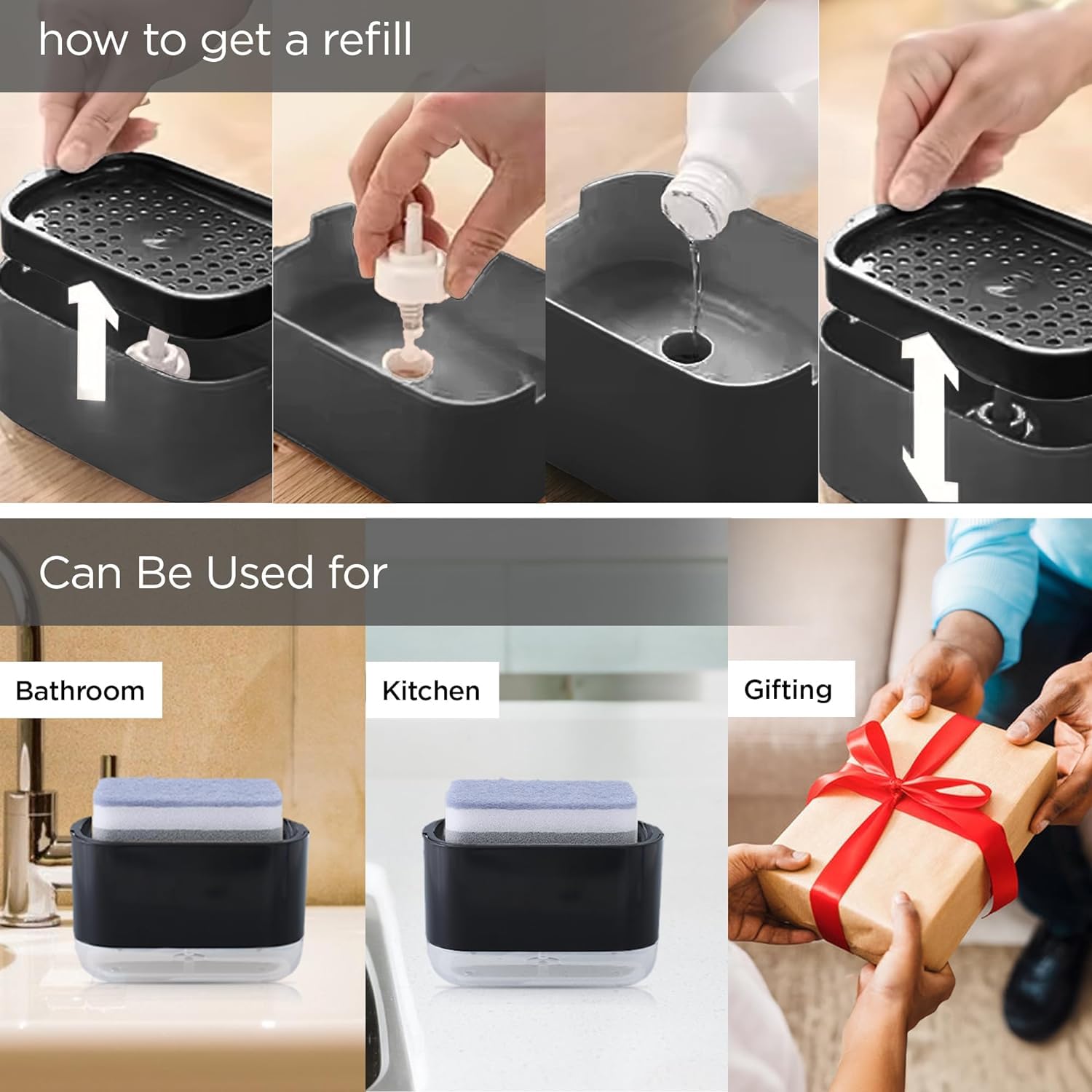 Introducing the Homestic Hollow Design Soap Dispenser, a versatile and essential addition to your kitchen and bathroom accessories collection. This 2-in-1 press soap dish is designed to provide convenience and efficiency for your daily handwashing and dishwashing needs. The sleek black dispenser boasts a durable and smooth body, ensuring long-lasting use. With a capacity of 300ml, this dispenser is lightweight and compact, making it easy to use with just one hand. The ergonomic design allows for easy press function to dispense soap onto your sponge. Constructed with ABS plastic, this soap dispenser is leakproof and refillable, providing a hassle-free experience. The components include a draining tray, pump head, box cover, and box body, ensuring a mess-free environment. The Hollow Design Soap Dispenser is perfect for use at the kitchen sink, bathroom wash basin, or even when cleaning your tiles, floor, counter, or walls. Ideal for families, kids, or anyone looking for an elegant and high-quality hand wash solution, this dispenser combines functionality with aesthetics. Customers love the aesthetic appeal and ease of use of this dispenser, making it a valuable addition to any home. Say goodbye to durability concerns, functionality issues, and leakage problems with the Homestic Soap Dispenser. Invest in quality, affordability, and design appeal with this versatile accessory.Detailed Specifications: