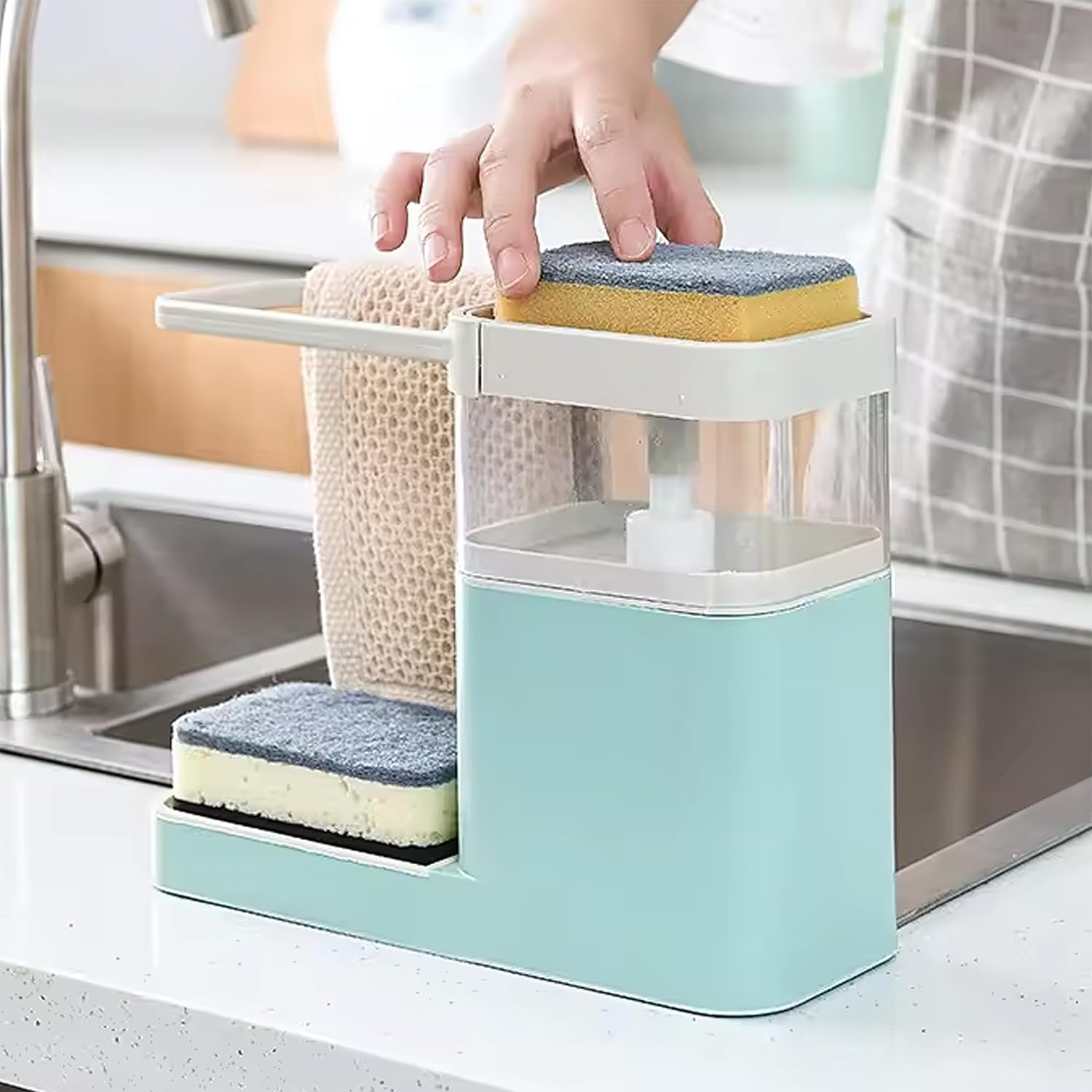 Introducing the Homestic 3 in 1 Soap Dispenser, a versatile and convenient addition to your bathroom or kitchen. This handwash dispenser is designed for everyday use, making it a perfect fit for families, kids, and individuals looking for a high-quality, elegant solution for their home. Crafted from durable and sturdy PP plastic, this soap dispenser is built to last. With a large capacity of 800ml, you can easily store and dispense your favorite liquid soap without the need for frequent refills. The sleek blue color and smooth surface of the dispenser add a touch of elegance to any space. The Homestic soap dispenser features a multifunctional design with a sponge holder, sponge drain tray, and towel rack, providing you with everything you need for quick and efficient dishwashing. The detachable design makes it easy to disassemble and clean, ensuring hassle-free maintenance. Customers love the aesthetic appeal and quality of the Homestic soap dispenser. Its one-handed operation and leak-proof design make it a practical and reliable choice for busy households. The bottom anti-slip mat keeps the dispenser in place, while the towel rack adds functionality to your kitchen or bathroom. Whether you're looking for a gift for a friend, mother, or college student, the Homestic soap dispenser is a thoughtful and practical choice. Its value for money, design appeal, and affordability make it a must-have accessory for any home. Experience the convenience and style of the Homestic 3 in 1 Soap Dispenser in your bathroom or kitchen today. Upgrade your daily routine with this high-quality, multifunctional kitchen accessory.Detailed Specifications:
