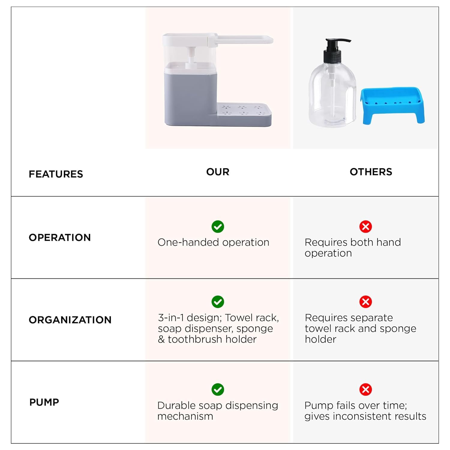 Introducing the Homestic 3 in 1 Soap Dispenser, a versatile and convenient addition to your bathroom or kitchen. This handwash dispenser is designed for everyday use, making it a perfect fit for families, kids, and individuals looking for a high-quality, elegant solution for their home. Crafted from durable and sturdy PP plastic, this soap dispenser is built to last. With a large capacity of 800ml, you can easily store and dispense your favorite liquid soap without the need for frequent refills. The sleek blue color and smooth surface of the dispenser add a touch of elegance to any space. The Homestic soap dispenser features a multifunctional design with a sponge holder, sponge drain tray, and towel rack, providing you with everything you need for quick and efficient dishwashing. The detachable design makes it easy to disassemble and clean, ensuring hassle-free maintenance. Customers love the aesthetic appeal and quality of the Homestic soap dispenser. Its one-handed operation and leak-proof design make it a practical and reliable choice for busy households. The bottom anti-slip mat keeps the dispenser in place, while the towel rack adds functionality to your kitchen or bathroom. Whether you're looking for a gift for a friend, mother, or college student, the Homestic soap dispenser is a thoughtful and practical choice. Its value for money, design appeal, and affordability make it a must-have accessory for any home. Experience the convenience and style of the Homestic 3 in 1 Soap Dispenser in your bathroom or kitchen today. Upgrade your daily routine with this high-quality, multifunctional kitchen accessory.Detailed Specifications: