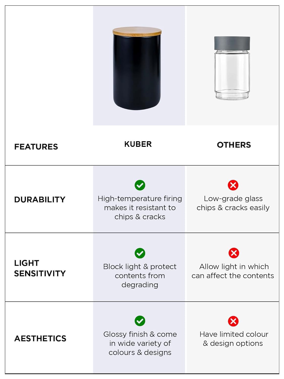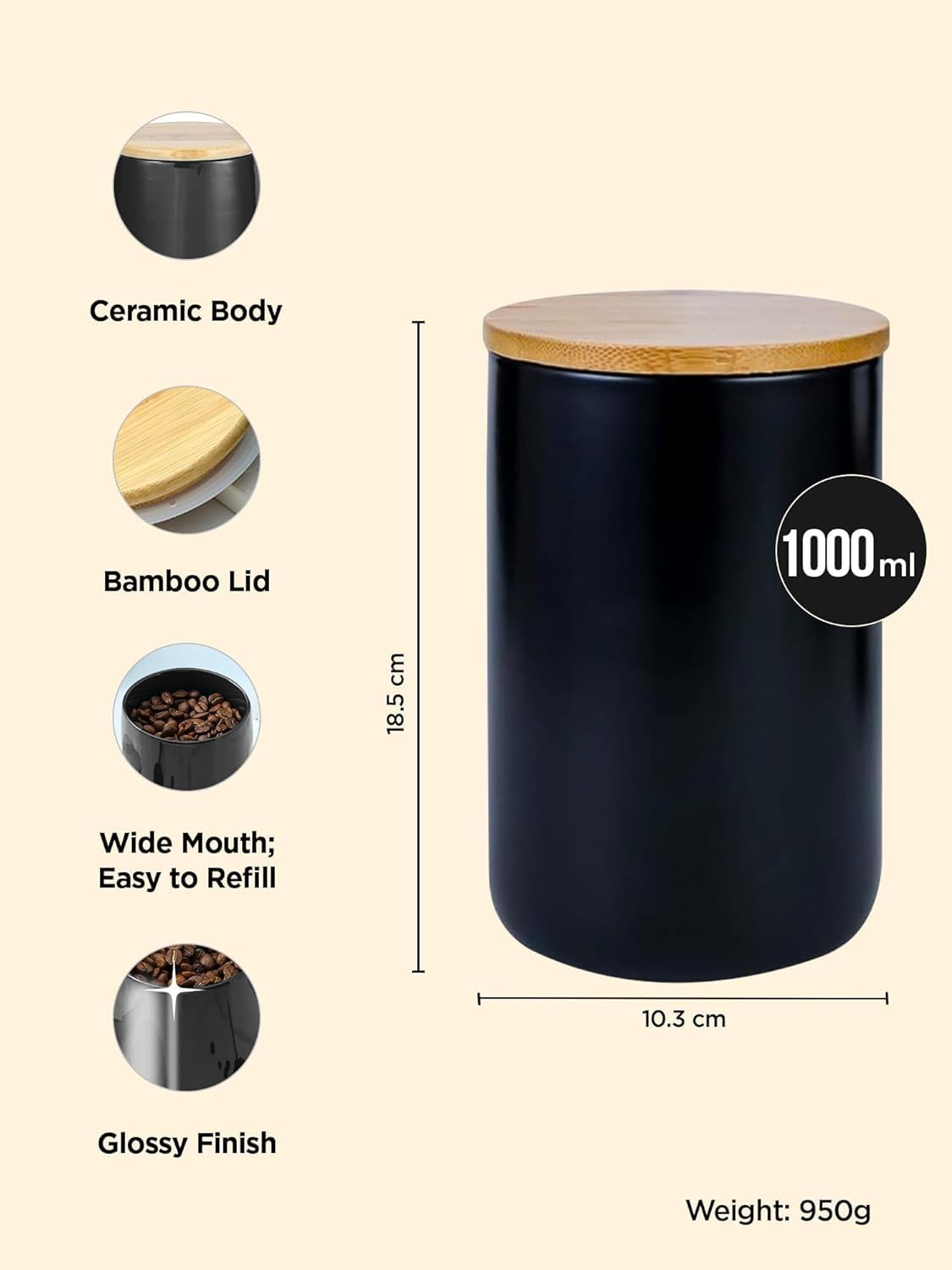 Introducing the Kuber Industries Ceramic Jar with Bamboo Lid - a must-have kitchen organizer for storing your essential kitchen items in style. Made with high-quality ceramic material, this sleek black container features a bamboo lid with a silicone ring for a secure airtight seal. The wide mouth design allows for easy access to your stored items, making it convenient for daily use. With a capacity of 1000ml, this multipurpose container set is perfect for storing a variety of kitchen essentials such as tea, coffee, snacks, sugar, salt, pulses, grains, dry fruits, and spices. The glossy finish adds a touch of elegance to your kitchen decor, making it perfect for gifting as well. Designed to meet the needs of mothers, families, and wives, this kitchen storage jar is ideal for use in the kitchen, kitchen cabinets, or even in the fridge. The BPA-free, reusable, and dust-resistant material ensures a safe and durable storage solution for your kitchen items. Customers love the high quality and aesthetically pleasing design of the Kuber Industries Ceramic Jar with Bamboo Lid. The value for money, along with the quality craftsmanship, makes it a highly recommended product for those looking to organize their kitchen in style. The Kuber Industries Ceramic Jar with Bamboo Lid is dishwasher safe, making it easy to clean and maintain. The included components come as a combo set, providing you with everything you need to keep your kitchen items organized and accessible. Say goodbye to lid issues, seal/vacuum problems, and quality concerns with this top-of-the-line kitchen storage container from Kuber Industries . Invest in the best for your kitchen and enjoy the convenience and elegance that this product has to offer. Elevate your kitchen storage game with the Kuber Industries Ceramic Jar with Bamboo Lid.Detailed Specifications: