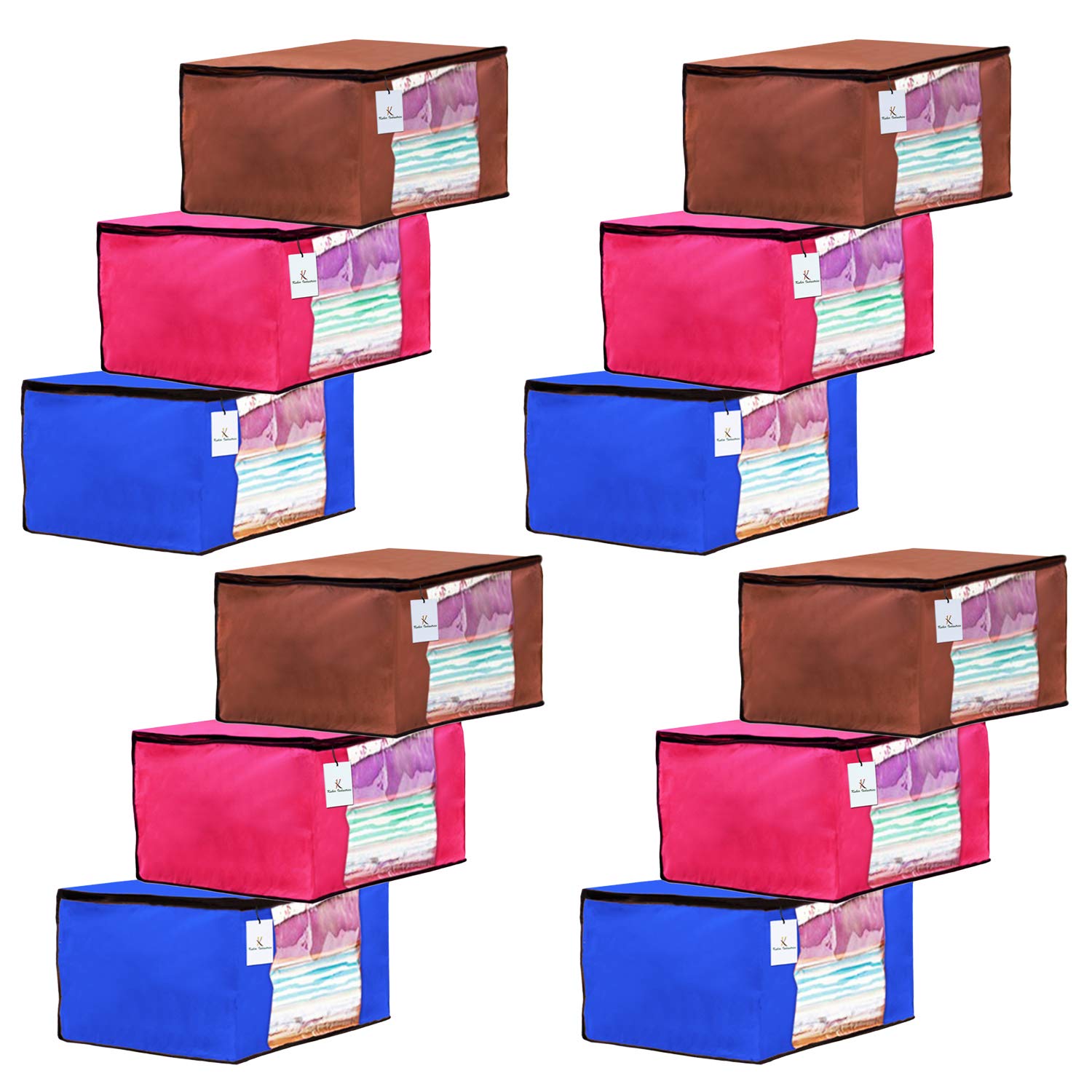 Made from durable, wear and tear-resistant non-woven fabric. Lightweight and flexible saree covers, carefully stitched to offer additional strength, size of each bag: 43 cm x 35 cm x 22 cm, transparent see-through window for easy identification of contents. Durable zipper for easy opening and closing, ideal for storing sarees and protecting them from dust and insects, package contents: 4 piece saree cover (color: Dark brown), 4 piece saree cover (color: Royal blue), 4 piece saree cover (color: Pink).