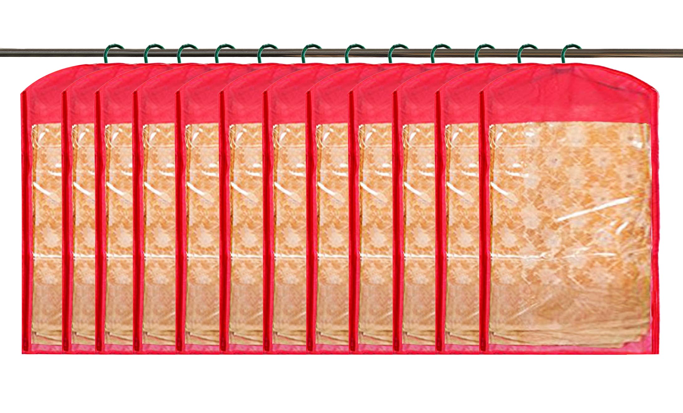 Kuber Industries 12 Pieces Non Woven Hanging Saree Cover Wardrobe Organiser with Hanger (Red) - CTKTC30950