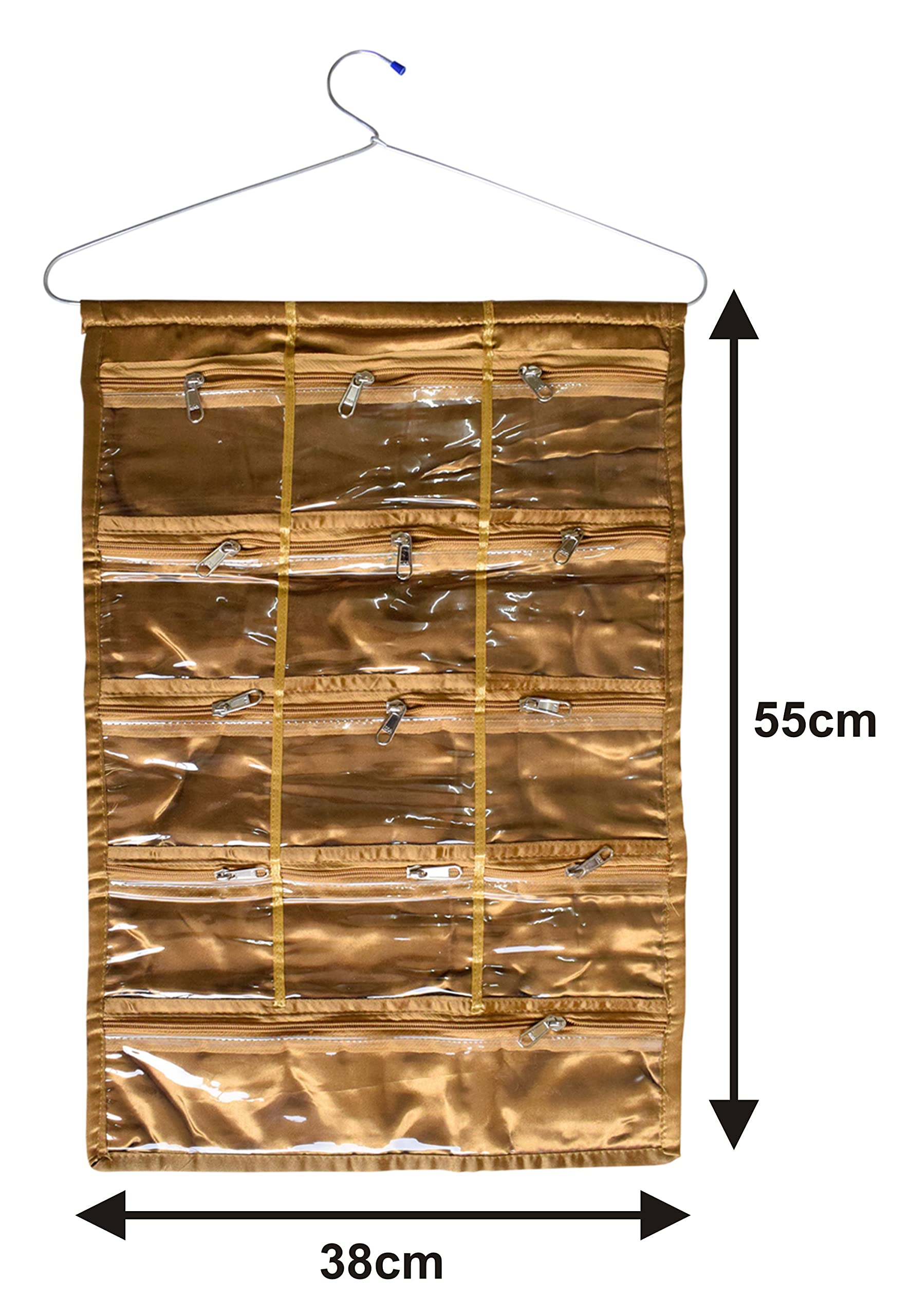 Kuber Industries 12 Small & 1 Large Zipper Pockets Hanging Jewellery Organizer Hanging Wall Pocket Storage Bag With Hanger (Gold)