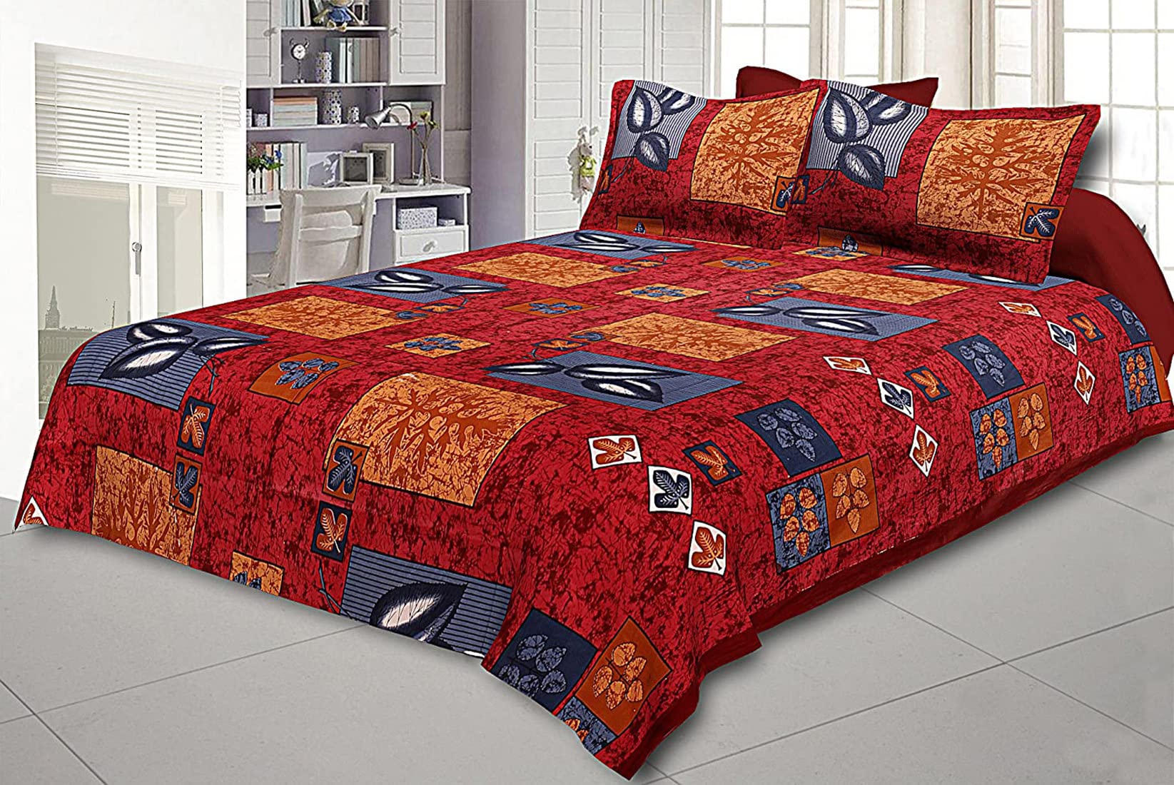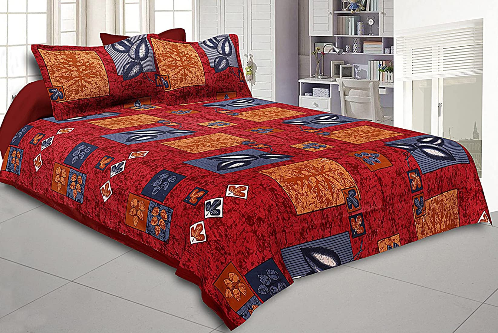 Made of 100 percent cotton material at Jaipur. This bed sheet comes with two pillow covers. The size of the bed sheet is 100x100 inches and the size of pillow cover is 30x22 inches. This is the soft and luxury bed sheet in affordable price and smooth and soft to the touch. This bed sheet gives the graceful and traditional look to your bed room and beautifully handcrafted through the traditional method. We are sure that if you purchase it, this will attract every person who comes into your bed room.Detailed Specifications: