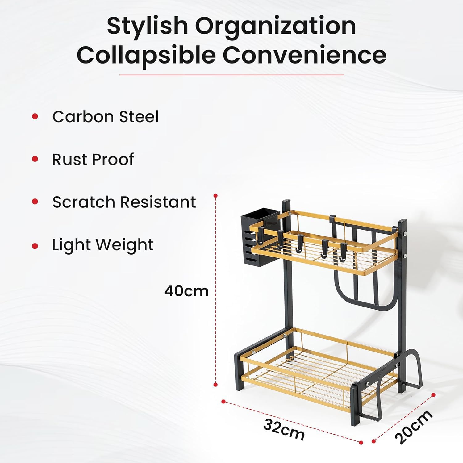 Kuber Industries Two-Layer Dish Drying Rack is a kitchen essential that combines efficiency and versatility. Its design prioritizes efficient drainage with a built-in drainboard, keeping your countertop dry and preventing bacterial growth. The multi-functional use of this rack extends beyond drying dishes, allowing you to store and organize various kitchen items. Constructed for stability, it features non-slip feet to ensure that your dishes and cookware remain secure. Its space-saving design is perfect for compact kitchens, as it maximizes vertical space while providing ample room for drying and storage.Detailed Specifications: