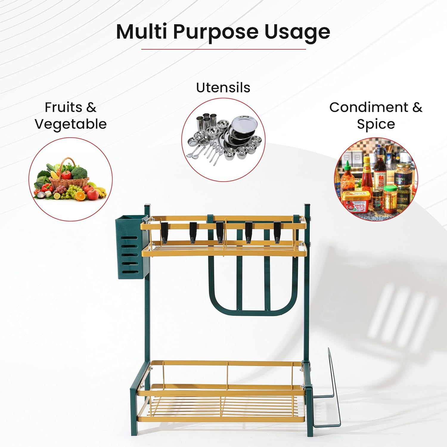 Kuber Industries Two-Layer Dish Drying Rack is a kitchen essential that combines efficiency and versatility. Its design prioritizes efficient drainage with a built-in drainboard, keeping your countertop dry and preventing bacterial growth. The multi-functional use of this rack extends beyond drying dishes, allowing you to store and organize various kitchen items. Constructed for stability, it features non-slip feet to ensure that your dishes and cookware remain secure. Its space-saving design is perfect for compact kitchens, as it maximizes vertical space while providing ample room for drying and storage.Detailed Specifications: