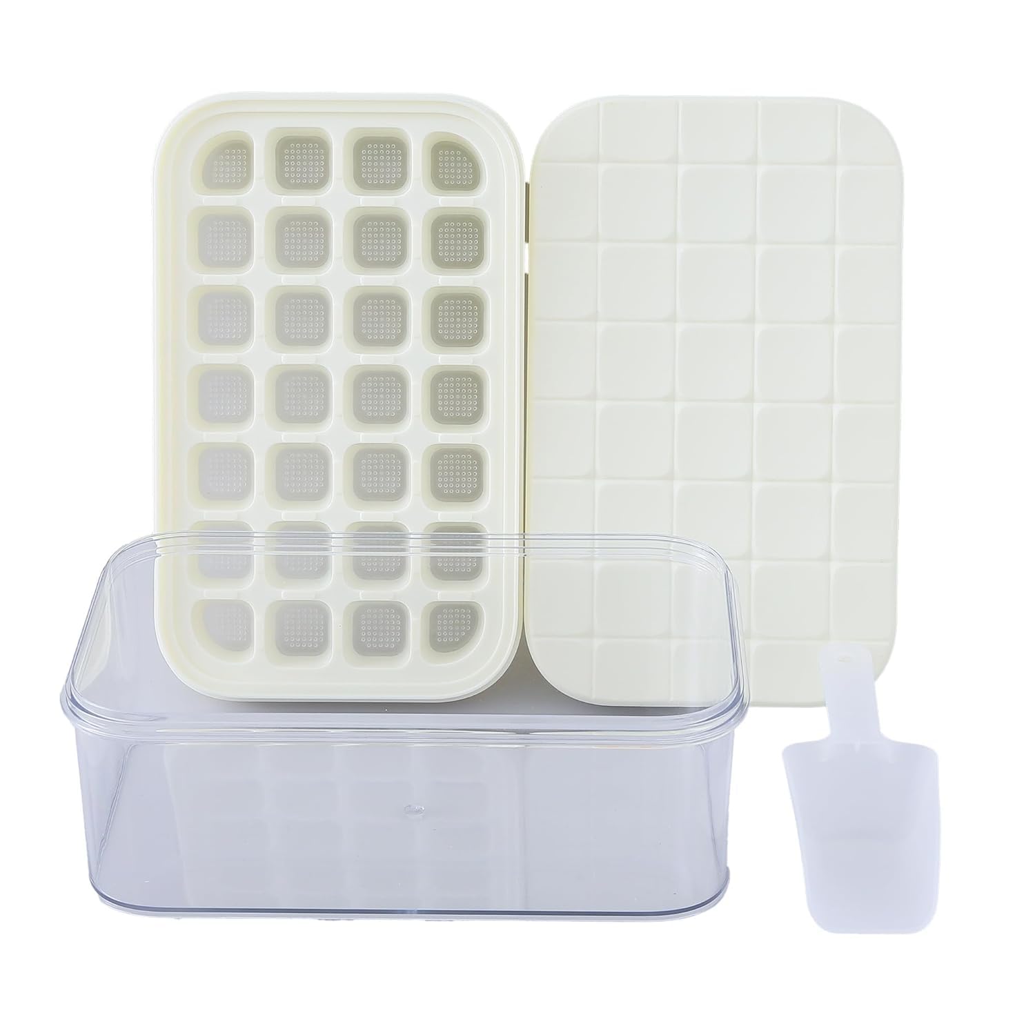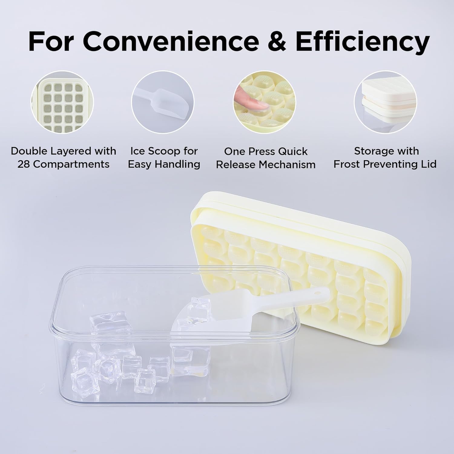 Say goodbye to flimsy, single-use ice cube trays and hello to our durable and convenient ice cube trays. Each tray is designed to produce perfectly shaped ice cubes that easily pop out with a simple twist, ensuring hassle-free ice making every time.Our set comes with a specially designed storage box, providing a dedicated space to store your ice cubes in the freezer. The storage box helps keep your ice cubes organized and prevents them from absorbing unwanted odors or flavors, ensuring that they taste fresh every time.No more struggling to remove ice cubes from the tray with your fingers. Our set includes a handy ice scoop that makes it easy to transfer ice cubes from the tray to your glass or cocktail shaker with precision and ease.Detailed Specifications: