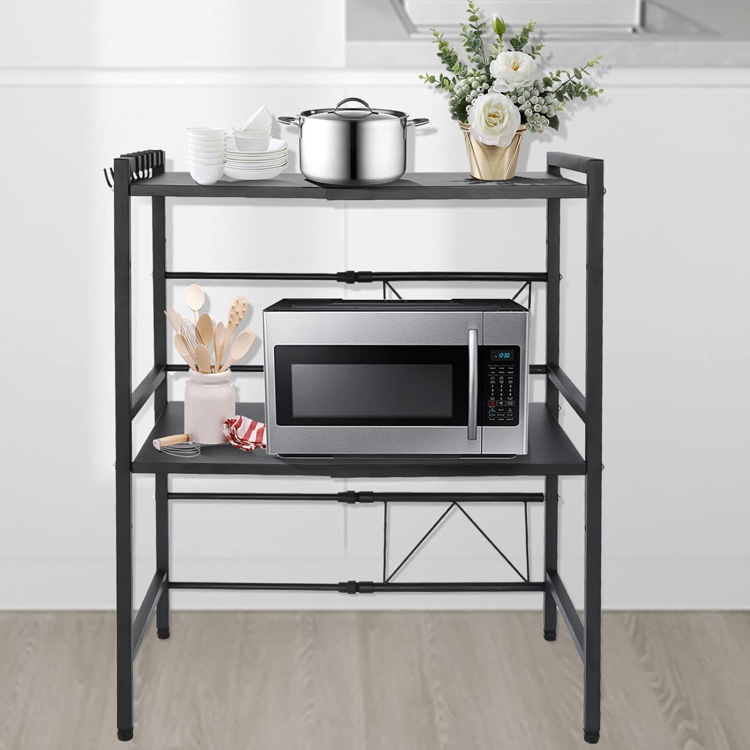 Homestic Microwave Oven Rack is a space-saving corner storage solution, featuring a robust and durable construction. Its thick and sturdy material ensures stability, making it a reliable platform for your microwave oven or other kitchen appliances. The rack's collapsible design allows for convenient storage when not in use, making it an excellent space-saving option. Additionally, it offers multi-purpose functionality, serving as a versatile storage solution for various kitchen items, from appliances to dishes and utensils.Detailed Specifications: