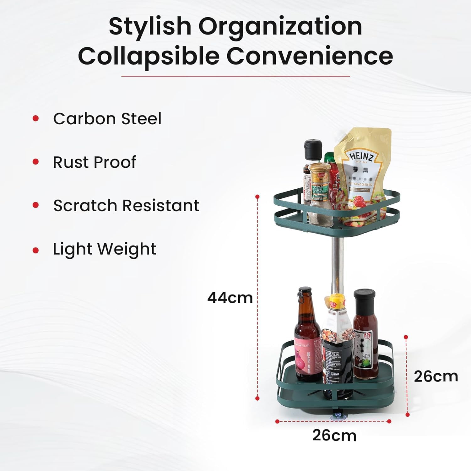 Kuber Industries Rotating Spice Rack is a practical and stylish addition to any kitchen. Its unique circular two-layer design features a 360° rotation, providing easy access to your favorite spices and condiments from any angle. With ample storage space, this spice rack can hold a variety of containers, helping you keep your kitchen organized. One of the standout features of this spice rack is that it requires no installation, making setup a breeze. It's also dismountable, allowing for easy cleaning and reorganization. Crafted from durable carbon steel with a protective paint finish, it's built to last and can withstand the rigors of everyday use. This spice rack not only helps you efficiently organize your kitchen but also adds a touch of sophistication with its sleek design. It saves valuable counter and cabinet space while ensuring that your spices are always within easy reach. Elevate your kitchen organization with the Kuber Industries Rotating Spice Rack. Is this conversation helpful so far?Detailed Specifications: