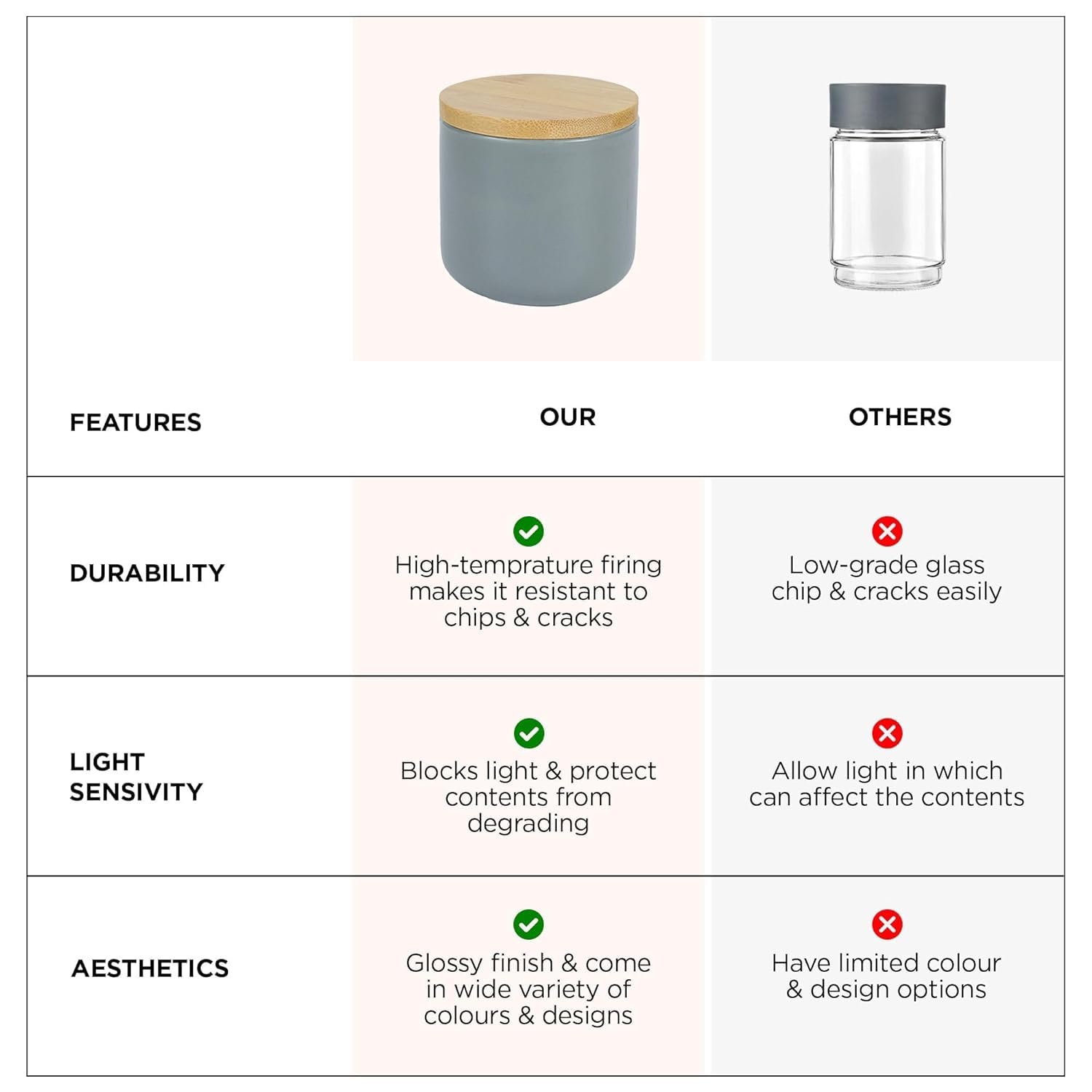 Welcome to the world of Homestic kitchen storage jars and containers, where high quality meets aesthetic appeal for all your kitchen organizing needs. Our Ceramic Jar with Bamboo Lid is the perfect solution for storing a variety of items in your kitchen, from pulses to grains, tea to snacks, and everything in between. Crafted from high quality ceramic material, our jar features a bamboo lid with a silicone ring to ensure a tight seal, keeping your food fresh for longer. The wide mouth design allows for easy access to your stored items, while the glossy grey finish adds a touch of elegance to your kitchen decor. With a capacity of 260ml, this multipurpose container is ideal for storing tea, coffee, snacks, sugar, salt, pulses, grains, dry fruits, and spices. Whether you're a mother looking to organize your family's snacks or a wife wanting to declutter your kitchen cabinets, this Homestic container is a must-have. Our jar is dishwasher safe, BPA free, reusable, and dust resistant, making it a convenient and practical storage solution for your kitchen. Say goodbye to lid issues, seal/vacuum problems, and concerns about quality and craftsmanship – our Homestic Ceramic Jar with Bamboo Lid has got you covered. Choose Homestic for a product that not only meets, but exceeds your expectations. Let us help you achieve a well-organized kitchen that is both functional and beautiful. Upgrade your kitchen storage game with Homestic today!Detailed Specifications: