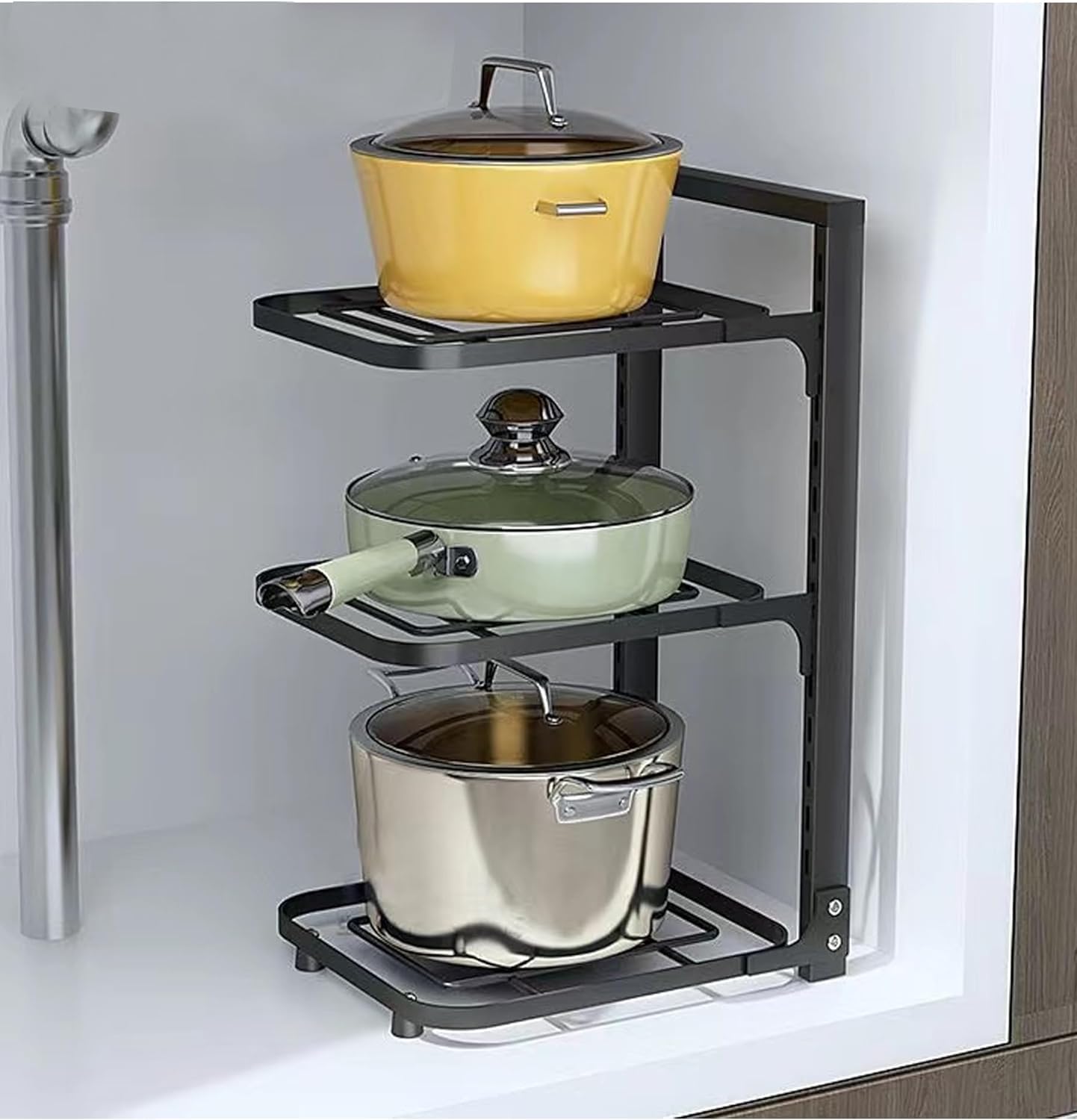 Homestic Pot & Pan Rack with 3 Layers is a versatile kitchen organization solution. Its corner storage design maximizes space efficiency in your kitchen. Crafted from thick and sturdy materials, it offers long-lasting durability and stability, ensuring your cookware is safe and well-organized. The adjustable layer height allows you to customize the rack to fit different pot and pan sizes, providing flexibility in storage.Detailed Specifications: