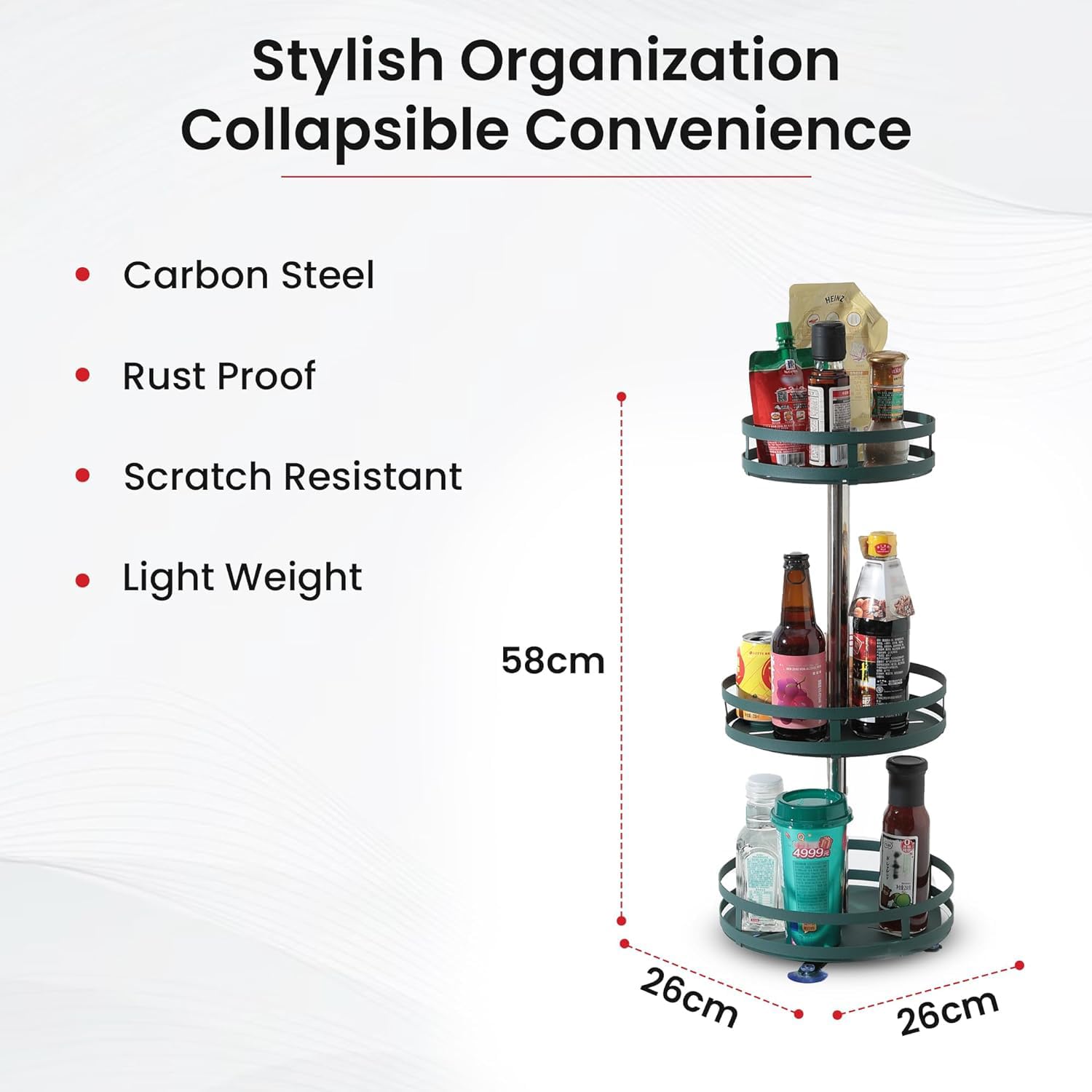 Kuber Industries Rotating Spice Rack is a practical and stylish addition to any kitchen. Its unique circular two-layer design features a 360° rotation, providing easy access to your favorite spices and condiments from any angle. With ample storage space, this spice rack can hold a variety of containers, helping you keep your kitchen organized. One of the standout features of this spice rack is that it requires no installation, making setup a breeze. It's also dismountable, allowing for easy cleaning and reorganization. Crafted from durable carbon steel with a protective paint finish, it's built to last and can withstand the rigors of everyday use. This spice rack not only helps you efficiently organize your kitchen but also adds a touch of sophistication with its sleek design. It saves valuable counter and cabinet space while ensuring that your spices are always within easy reach. Elevate your kitchen organization with the Kuber Industries Rotating Spice Rack. Is this conversation helpful so far?Detailed Specifications: