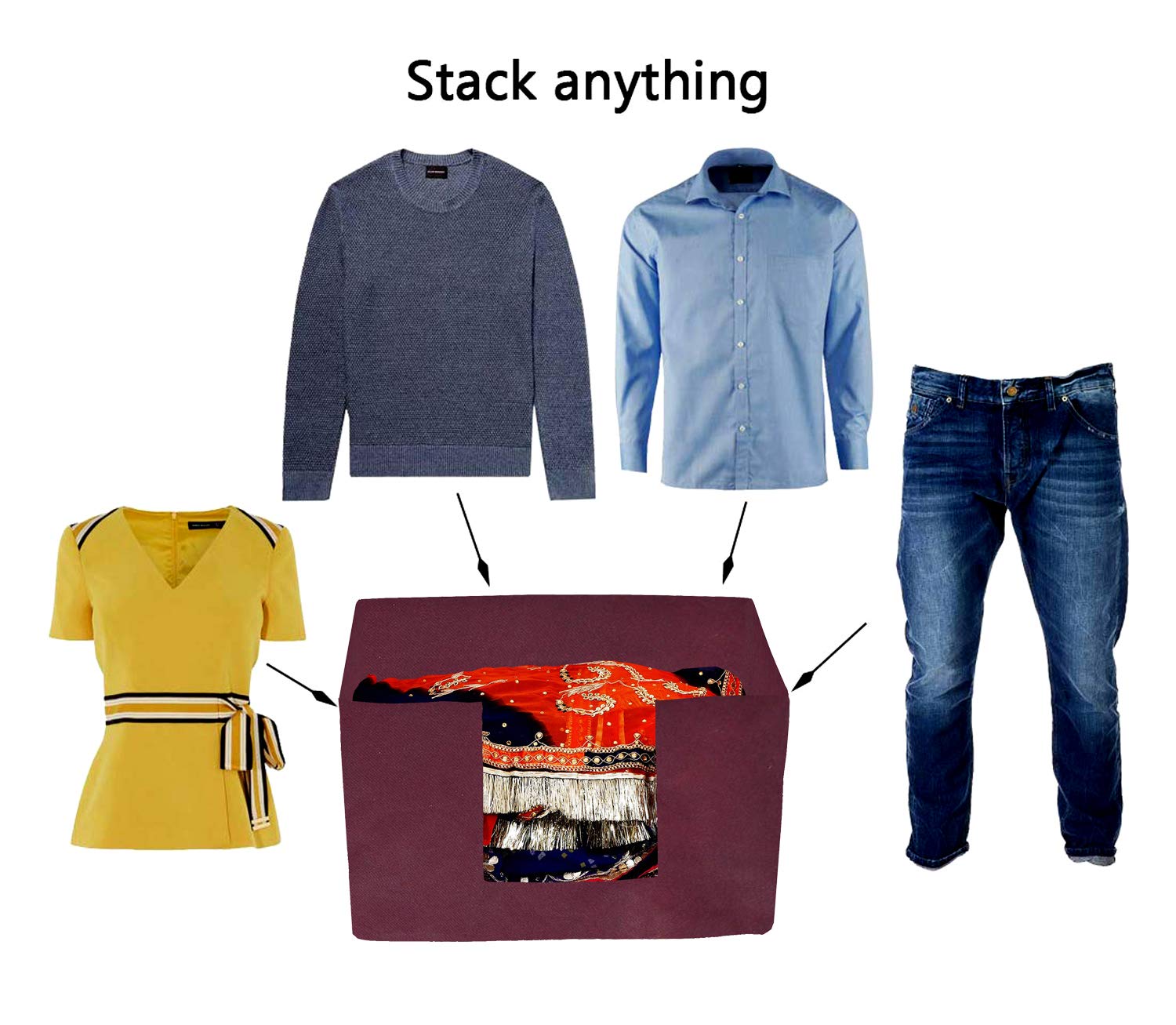 HIGH CAPACITYA great Shirt organizers for clothing, it is big enough to use as a Jean organizer, shirt organizer, pant organizer, bra organizer etc.no more worrying about not being able to fit your Clothes. It is also a great jeans organizer for drawer and pants organizer for closet shelf. | STURDY & STACKABLEMade of sturdy Non-Woven material instead of flimsy nylon fabric to help the jeans and shirt organizer to keep the shape. The bottom of the closet organizer is inserted with cardboard, which can keep them from collapsing and squishes the clothes. | STRONG HANDLESUsing delicate sewing techniques, the handle and storage box are sewn to perfection. The handle is sturdy and easy to move, you can move it to the living room, bedroom, dresser, drawer, wardrobe, etc. | FOLDABLESoft and foldable, when not in use, it can be folded and placed in any small space, saving more space and easy to use. This is a great organizing companion for your clothes in the wardrobe that keeps your clothes well maintained in one place. |