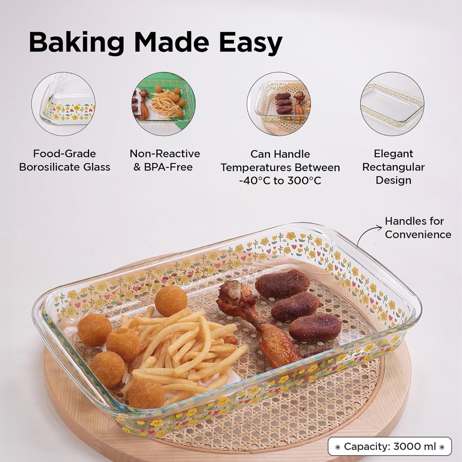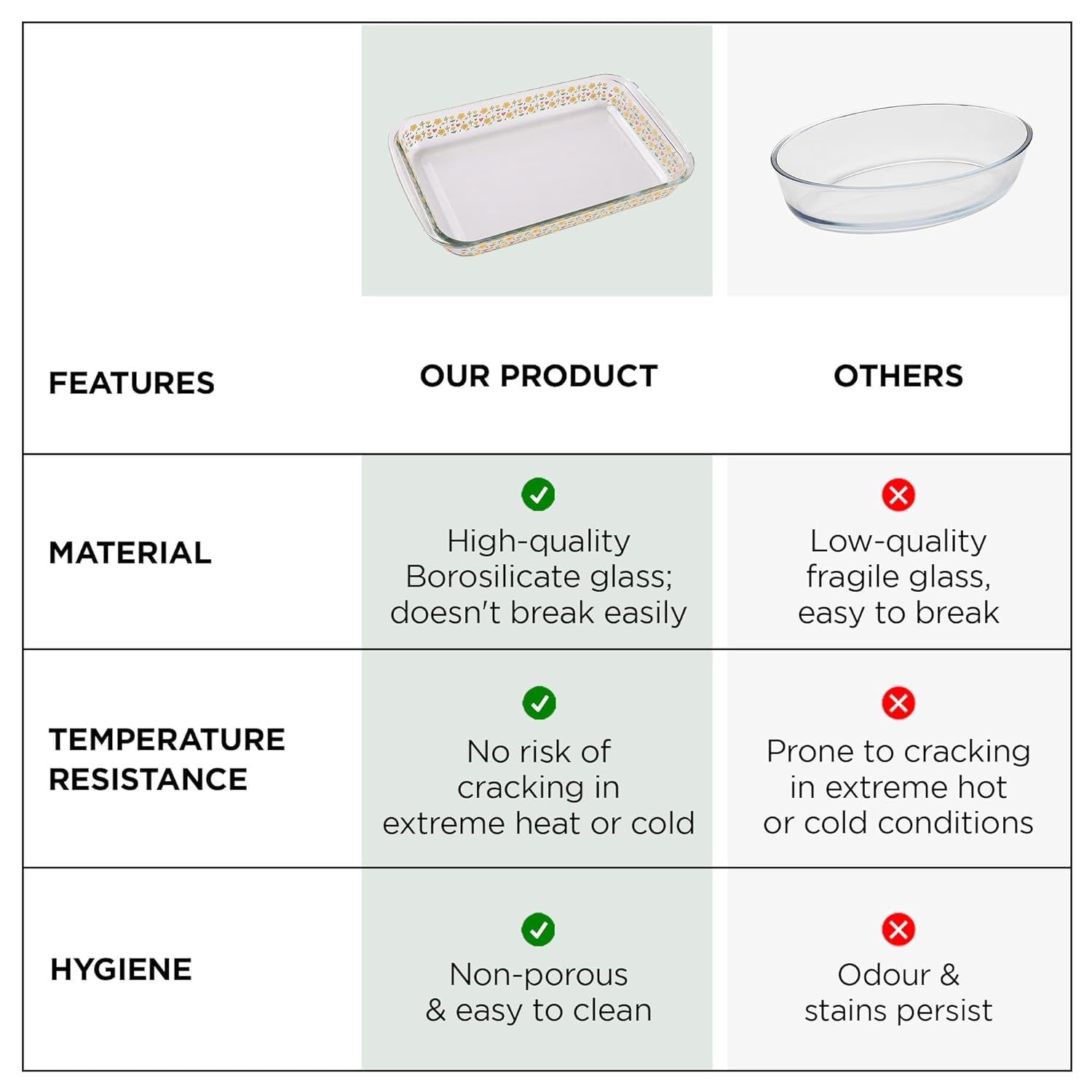 Introducing the Homestic Borosilicate Printed Glass Baking Tray, a versatile addition to your kitchen essentials. Made of high-quality Borosilicate Glass, this transparent baking tray is not only suitable for baking, grating, and serving but also safe to use in the microwave, oven, freezer, and dishwasher. With a capacity of 3000 ml and dimensions of 39.3x23.6x5.2cm, this rectangular baking tray is perfect for baking cookies, cakes, pastries, bread, roasting meats, vegetables, and even fruits. You can also use it to reheat leftovers, marinate, freeze food, and prepare delicious grilled dishes. Customers love the non-porous, odor-free, BPA-free, and non-toxic nature of this glass bakeware dish, ensuring safe and healthy cooking. Easy to clean and with a glossy finish, this baking tray is a one-stop solution for all your baking and serving needs. Whether you're a home baker, professional chef, or a cooking enthusiast, this Homestic Glass Baking Tray is a must-have in your kitchen. Its multipurpose use, durability, and convenience make it a top choice for those who value quality in their cookware. Say goodbye to concerns about using harmful materials in your kitchen and embrace the safety and functionality of the Homestic Borosilicate Printed Glass Baking Tray. Upgrade your cooking experience with this reliable and versatile bakeware dish that exceeds customer expectations.Detailed Specifications: