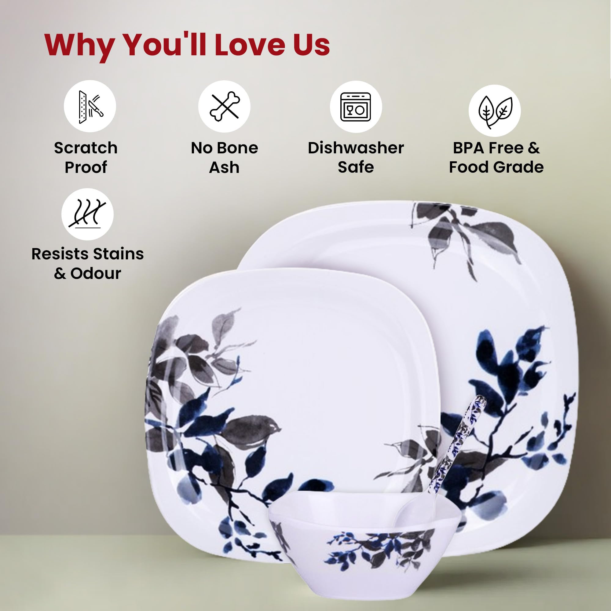 Kuber Industries 31 Pieces Square Unbreakable Microwave & Dishwasher Safe Melamine Dinnerware Kitchen Crockery Set | Glossy Dinner Set & Kitchen Set for Home | Blue Vine (Bail) - White