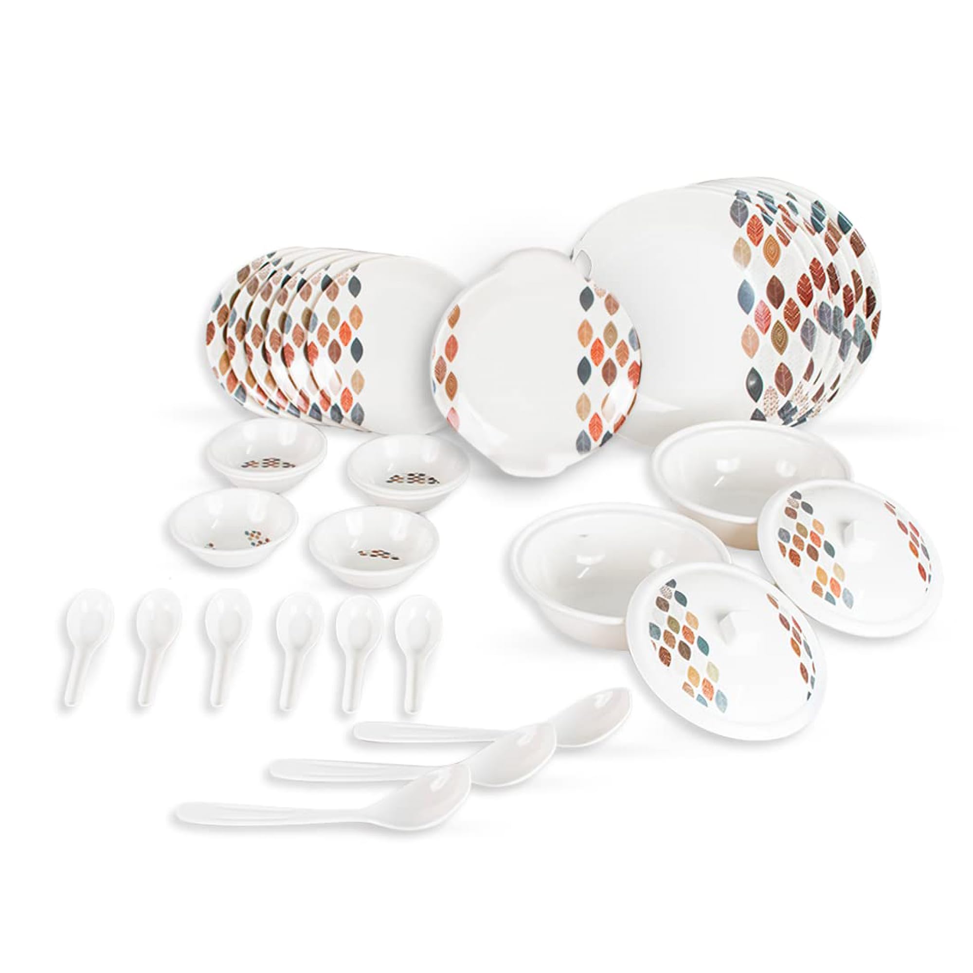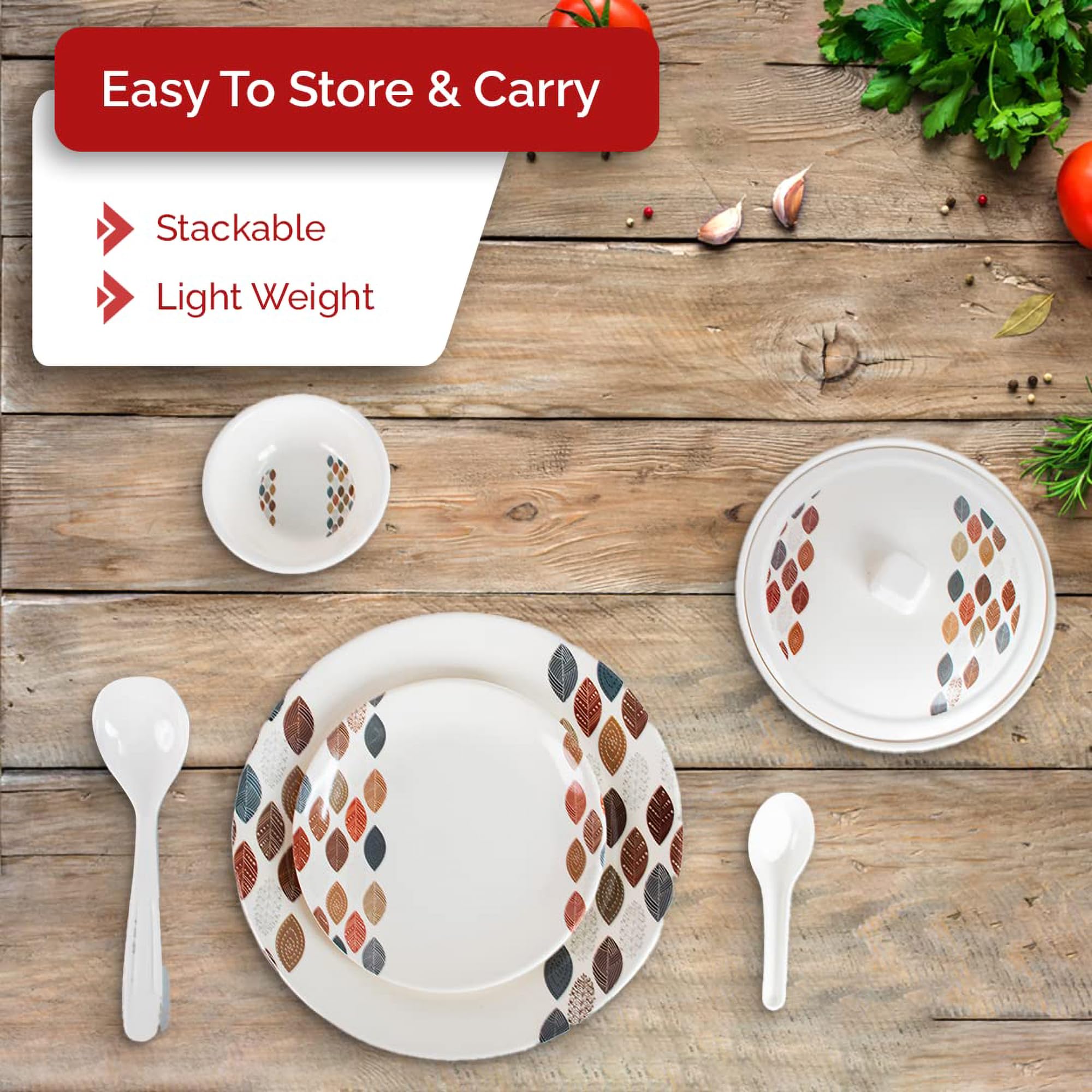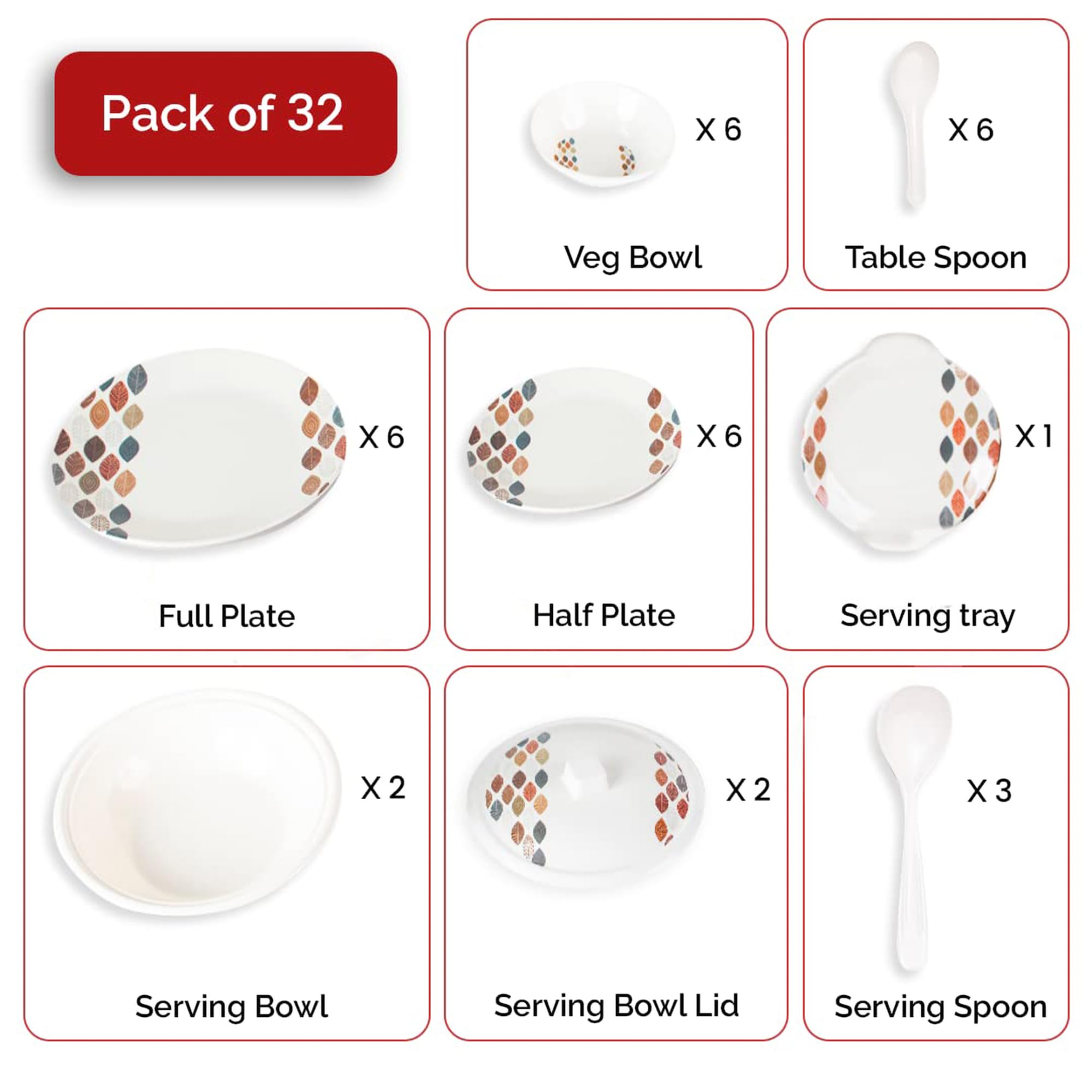 • ✅ Package Contains - (Set of 1, Pcs - 32) Dinner Set | Color - Stylon Leaf Dots - White | Material - Melamine | Product Dimensions - 31X20X28CM