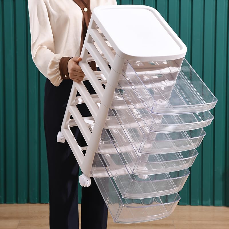 Kuber Cosmetic 5 layer plastic cabinet with Trolley offers a convenient and efficient solution for organizing your cosmetics and beauty essentials. This versatile cabinet is designed with multiple layers and features transparent and visible drawers that smoothly pull out without the risk of falling off. With its larger capacity, you can store a wide range of items, keeping everything neatly organized.Detailed Specifications: