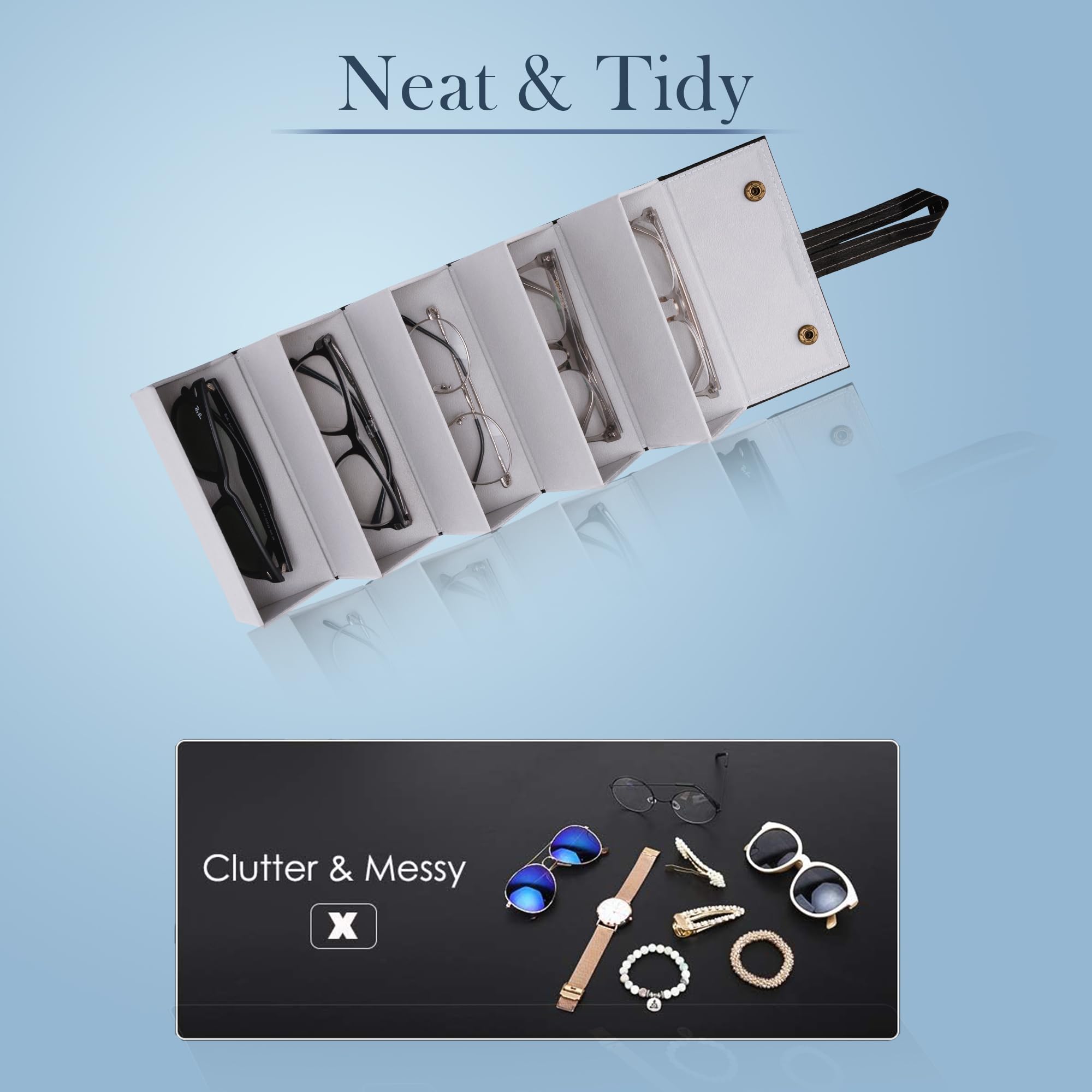 The Hanging and Foldable Sunglasses Organizer is not just a storage solution; it's a stylish addition to your home decor. Crafted from quality materials, it features a sleek and modern design that complements any interior. The organizer comes in a variety of colors and finishes, from classic black and white to elegant wood grain and metallic options, ensuring that it can seamlessly blend into any room’s aesthetic.One of the standout features of this organizer is its ability to make the most of your available space. It offers ample room to store sunglasses. Each compartment is designed to hold sunglasses of various sizes and shapes, from oversized aviators to sleek wayfarers.When not in use, the organizer can be easily folded down to a compact size, making it incredibly easy to store in a drawer or under the bed. This foldable design is perfect for those with limited space or for anyone who enjoys keeping their living area neat and tidy.Detailed Specifications: