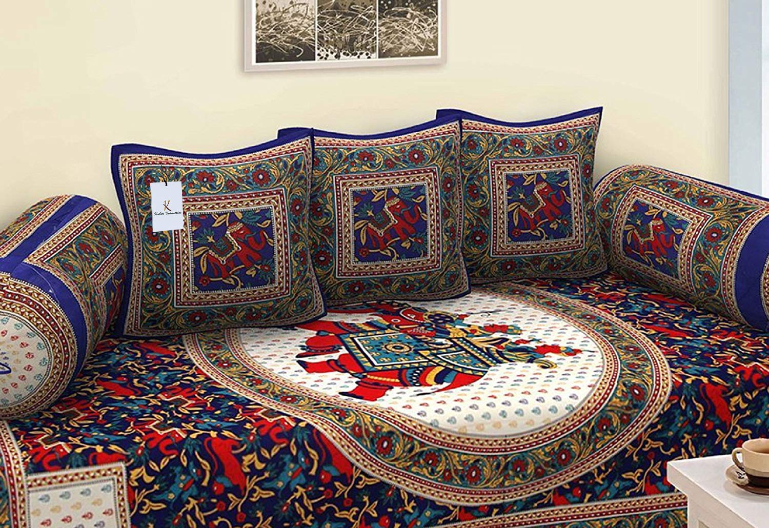 Material: Cotton, Thread Count: 144. Color: Blue & Cream, Pattern: Elephant Design. Package Contents: 1 Bedsheet, 3 Cushion Covers and 2 Bolster Covers. Size: Bedsheet: 86 inch x 56 inch or 218 cm x 142 cm, Cushion Cover: 16 inch x 16 inch or 41 cm x 41 cm, Bolster Cover: 30 inch x 15 inch or 76 cm x 38 cm. Care Instructions: Get the product dry-cleaned for the first time to maintain the vibrancy of the fabric, Regular machine or hand wash in normal or luke warm water.Detailed Specifications: