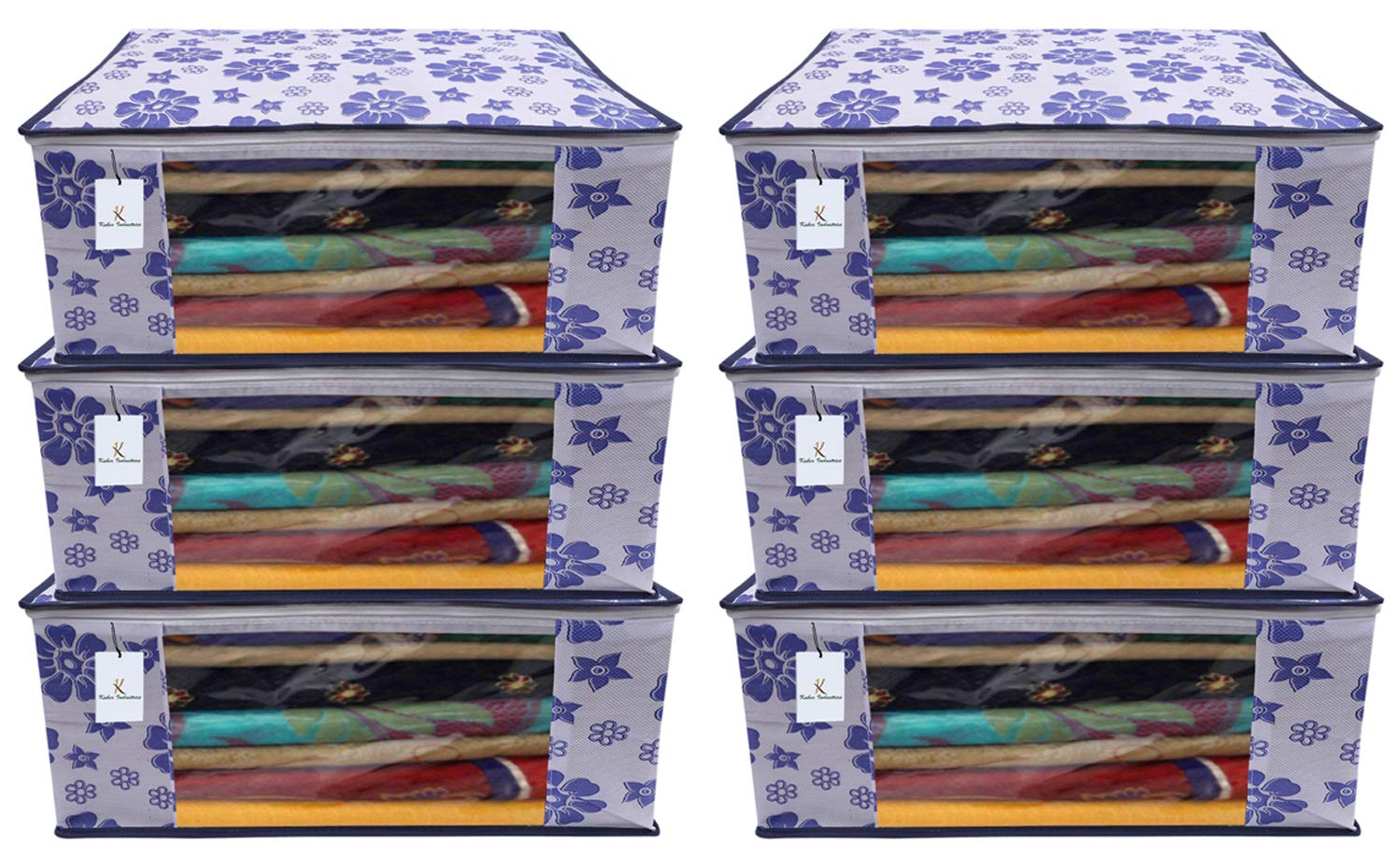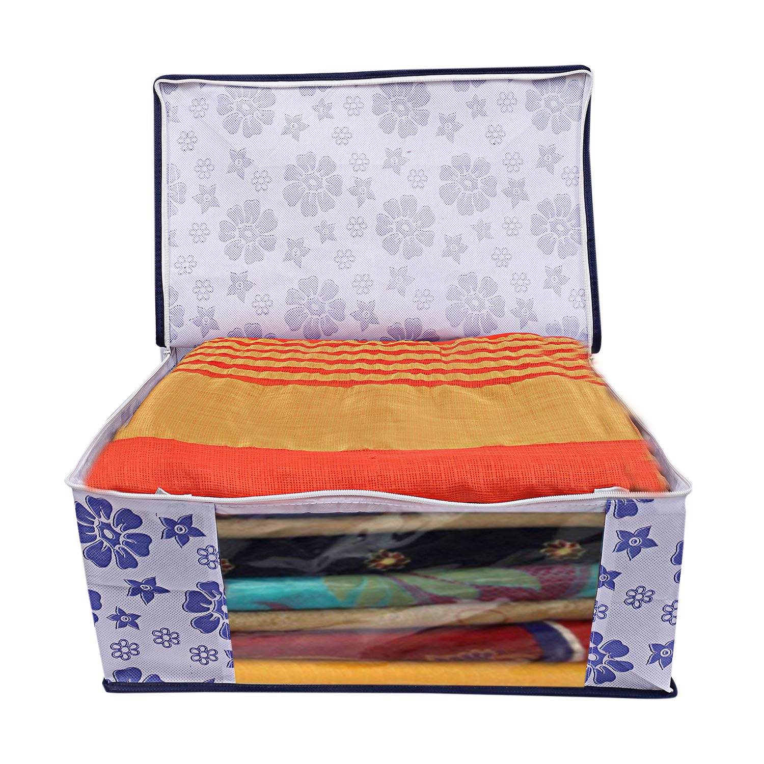 Made from durable, wear and tear-resistant non-woven fabric. Can Keep upto - 8 to 10 Sarees .Lightweight and flexible saree covers .Carefully stitched to offer additional strength .Transparent see-through window for easy identification of contents .Durable zipper for easy opening and closing .Long life High quality saree cover Bag for organizing your costly and favourite sarees .Package Contents: 6 Pieces Saree Covers,Color- Royal Blue, Flower DesignDetailed Specifications: