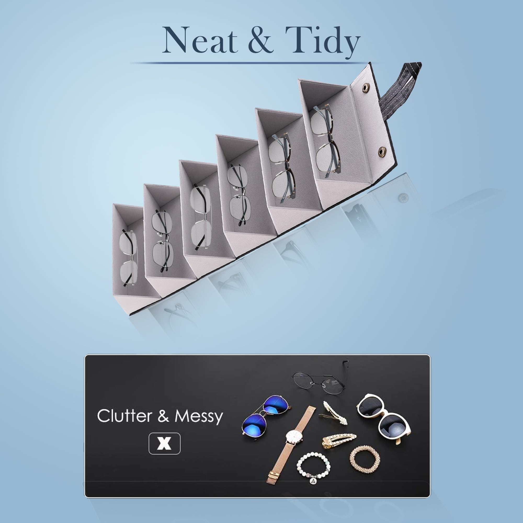 The Hanging and Foldable Sunglasses Organizer is not just a storage solution; it's a stylish addition to your home decor. Crafted from quality materials, it features a sleek and modern design that complements any interior. The organizer comes in a variety of colors and finishes, from classic black and white to elegant wood grain and metallic options, ensuring that it can seamlessly blend into any room’s aesthetic.One of the standout features of this organizer is its ability to make the most of your available space. It offers ample room to store sunglasses. Each compartment is designed to hold sunglasses of various sizes and shapes, from oversized aviators to sleek wayfarers.When not in use, the organizer can be easily folded down to a compact size, making it incredibly easy to store in a drawer or under the bed. This foldable design is perfect for those with limited space or for anyone who enjoys keeping their living area neat and tidy.Detailed Specifications: