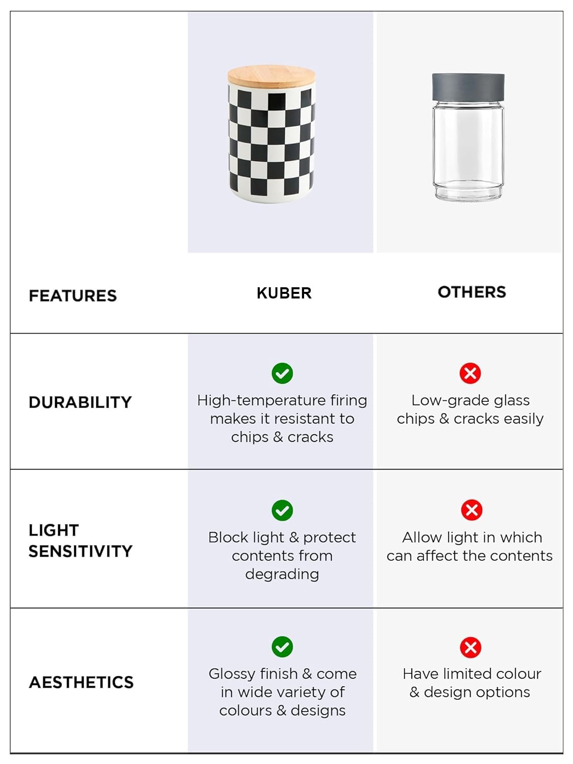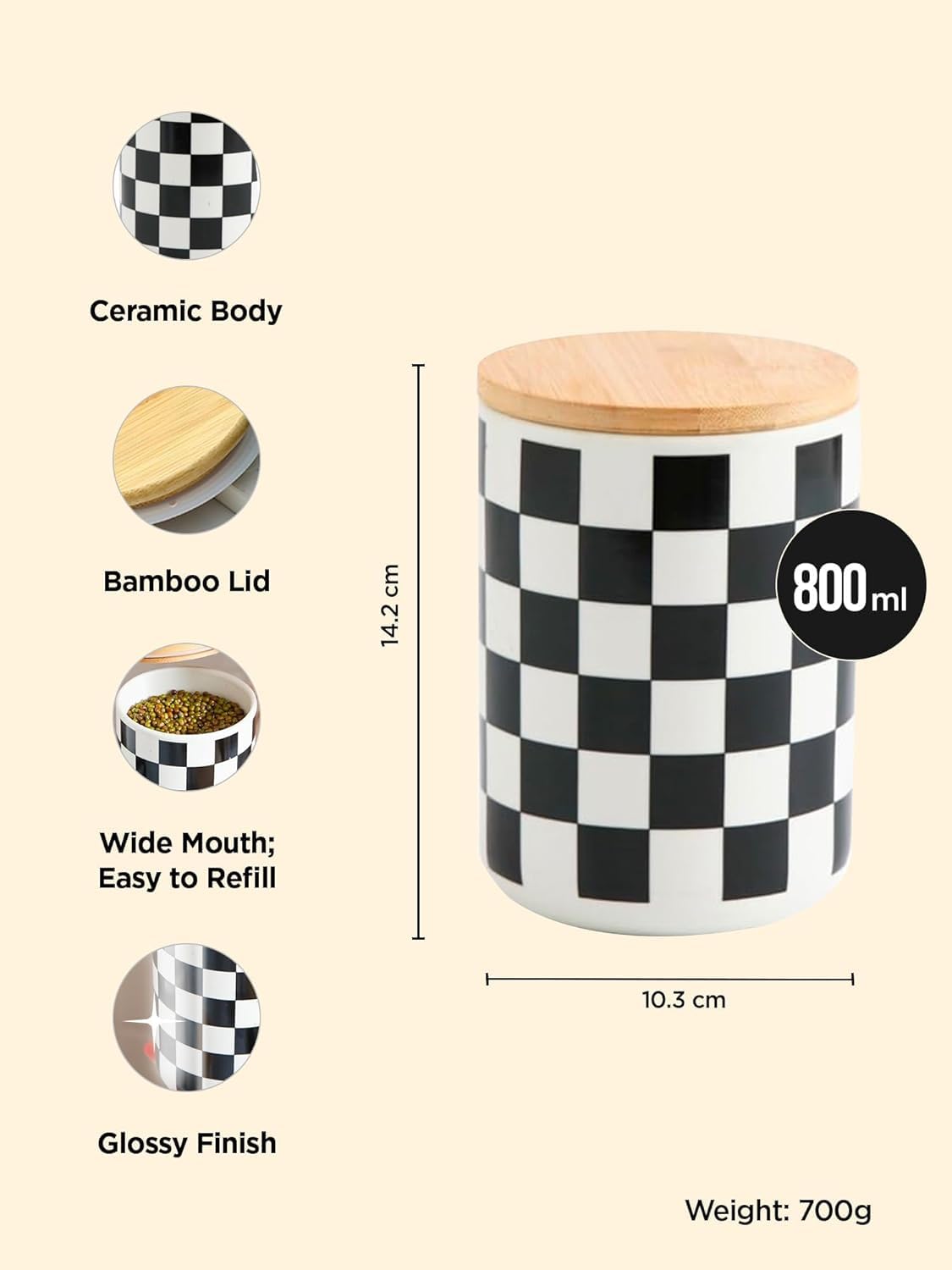 Introducing the Kuber Industries Ceramic Jar with Bamboo Lid, the perfect addition to your kitchen storage collection. Made from high-quality ceramic material, this jar boasts a glossy black and white finish that is both aesthetically pleasing and durable. The bamboo lid features a silicone ring for a secure airtight seal, keeping your contents fresh for longer periods. With a generous capacity of 800ml, this multipurpose container is ideal for storing a variety of items such as tea, coffee, snacks, sugar, salt, pulses, grains, dry fruits, and spices. The wide-mouth design makes it easy to access your stored goods, while the sleek elongated shape fits perfectly in kitchen cabinets or on countertops. Designed to cater to the needs of mothers, families, and wives, the Kuber Industries Ceramic Jar is a versatile storage solution that combines quality, functionality, and style. Whether you're organizing your pantry, gifting a loved one, or simply adding a touch of elegance to your kitchen, this jar is sure to impress. Customer satisfaction is our top priority, which is why we have addressed common concerns such as lid issues and seal/vacuum problems. Our jar is dishwasher safe, BPA-free, reusable, and dust resistant for your peace of mind. Plus, it comes with a packer contact information for any queries or assistance you may need. In conclusion, the Kuber Industries Ceramic Jar with Bamboo Lid is a must-have for anyone looking for a reliable and chic storage solution. With its blend of quality craftsmanship, functional design, and customer-friendly features, this jar ticks all the boxes for recommendation, aesthetic appeal, value for money, and high quality. Upgrade your kitchen storage game with Kuber Industries today!Detailed Specifications: